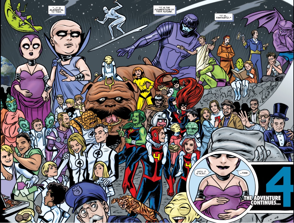 The second half of the book focuses on the cast of both Fantastic Four and the Future Foundation throwing a party once the day is saved. Uatu and Silver Surfer show up (setting up both the Allred’s Silver Surfer book and Original Sin) to bring some cosmic fun. We get to check in with all of the children before the final page and it reminds us that they are the foundation of the future, even if they don’t have a book at the moment. Good heart warming stuff, beautifully drawn by the Allreds.