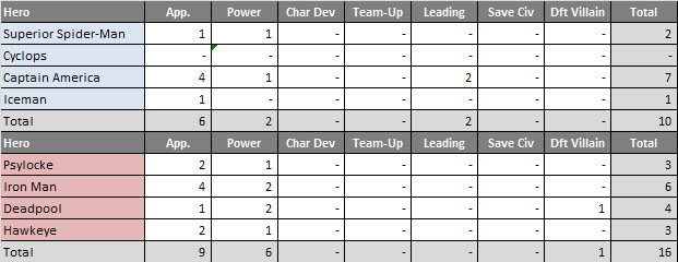 Deadpool: Appearance, 1 point (Deadpool #23); Power, 2 points (Mows down from above with bullets, recreates acid kill from Alien); Defeats the Bad Guy, 1 point
