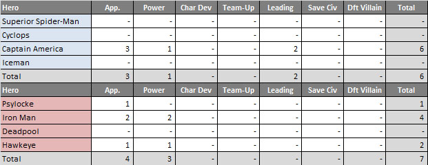 Captain America: Appearance, 3 points (He doesn’t even appear in his own comic! But, All-New Invaders #2 – doing nothing, Loki #1 – doing nothing, and Avengers A.I. – at least doing a little something); Power, 1 point (Shield Throw, why did I not pick Shield Bash!?); Leading the Team, 2 points (Assembling the Avengers in two different comics, per usual)