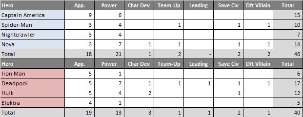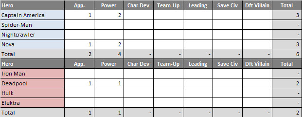 Spider-Man: Appearance, 1 point (Superior Spider-Man #31)Power, 3 points (Offensive Webbing, Strength, Spider-Sense); Team-Up, 1 point (with his 2099 counterpart); Civilian Save, 1 point; Defeated Villain, 1 point