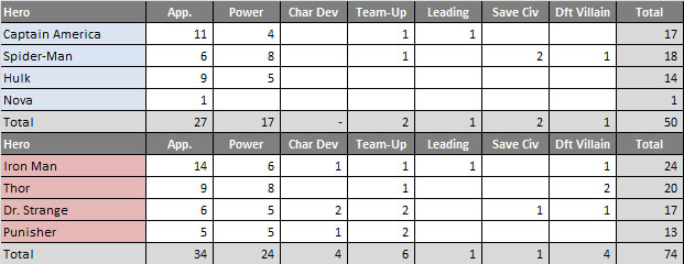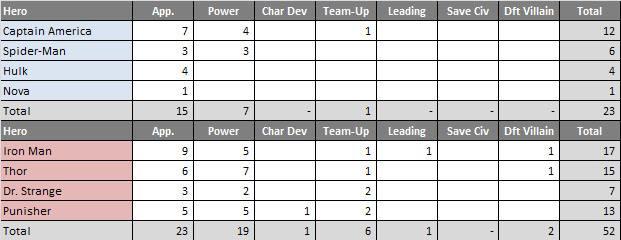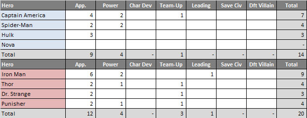 Captain America: Appearance, 3 points (Avengers #31, Nova #18, Thunderbolts #27)); Power, 2 points (Shield Throw in Nova and again in Thunderbolts)