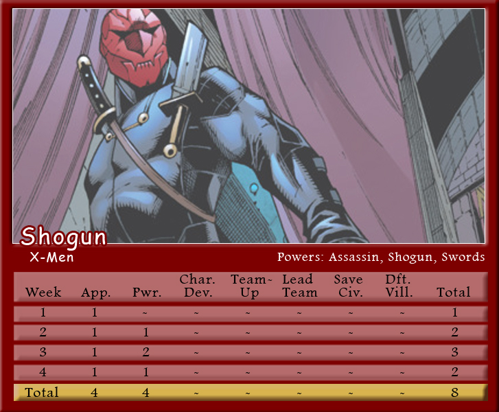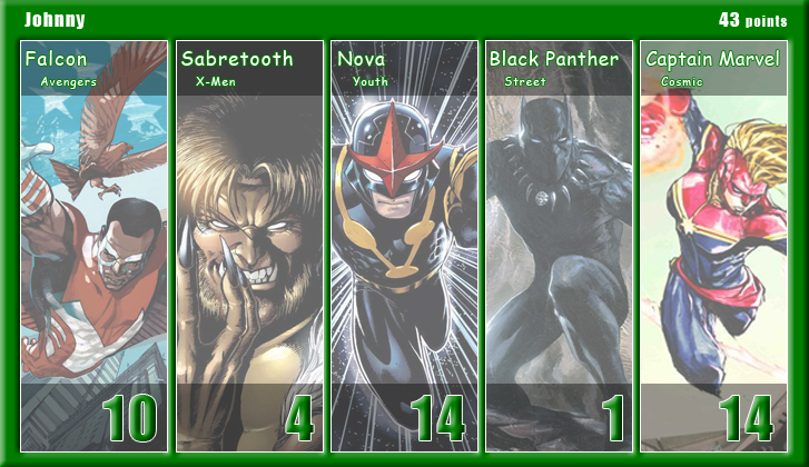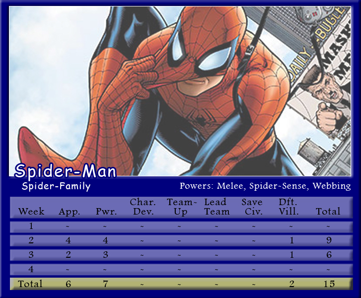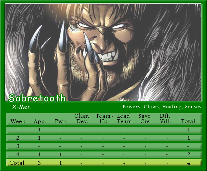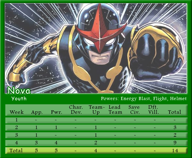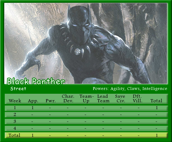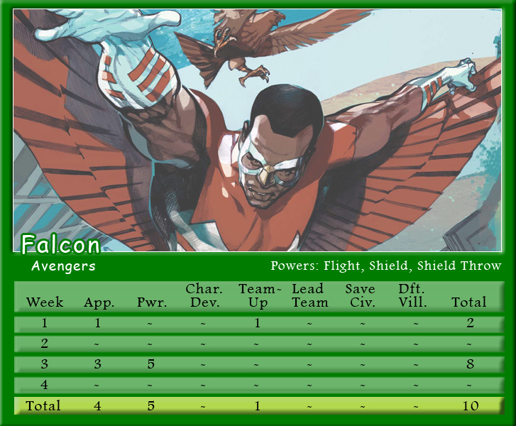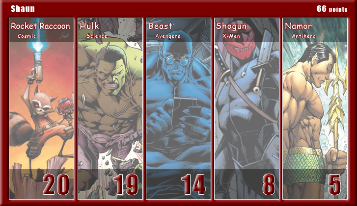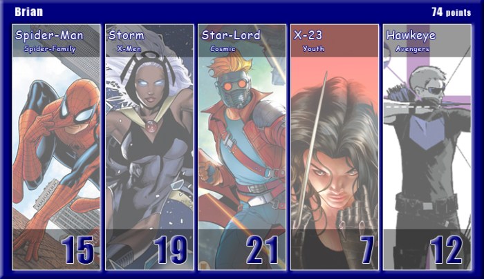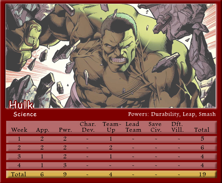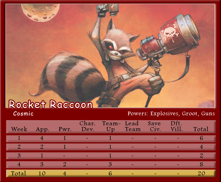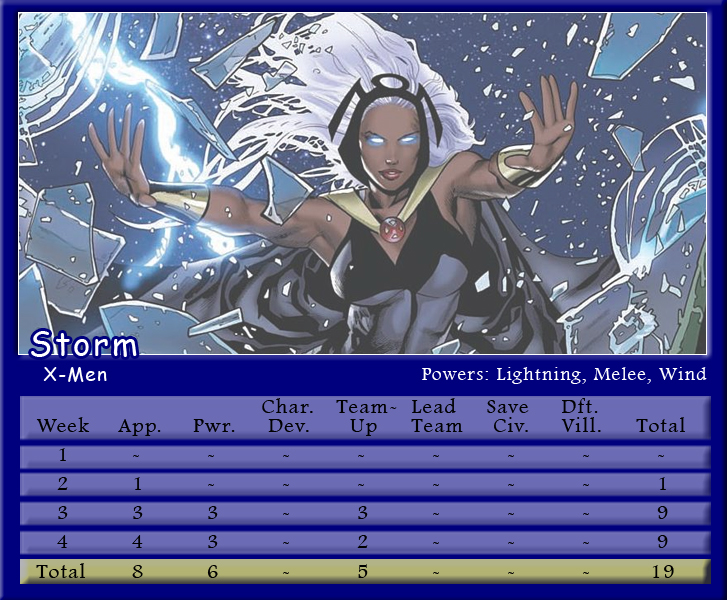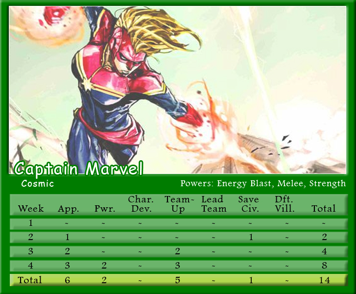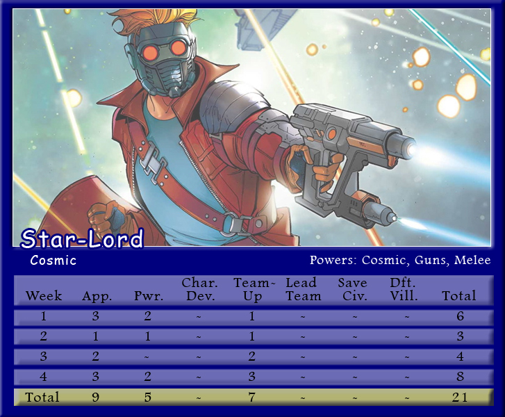The Black Vortex transforms Brian’s team into an unstable force. Star-Lord is on the winning team for the second month in a row and more than doubles his score to be the points leader with 21. His fellow Guardian, Rocket Raccoon, notches 20 points and leads Shaun’s team to a second place finish. X-Men teammates and fellow Black Vortex stars, Storm and Beast, tie with 19 points for the third highest scores. Johnny brings Black Panther into the mix, but he only manages one appearance point. As for actual heroics, Captain Marvel is the only hero to save a civilian in March, and Spider-Man is the only character to defeat a villain. Make sure to follow along with Podcast Episode 49 – The Weakest of the Week for a full breakdown of points.