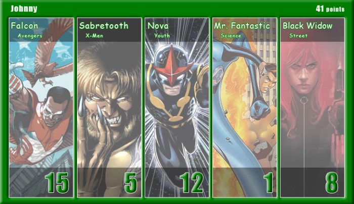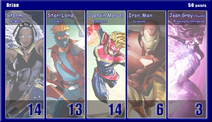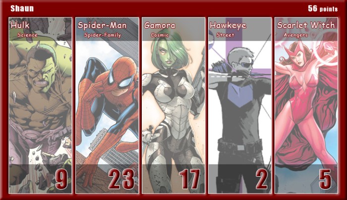The ultimate betrayal! Brian went against everything he knew and kept Storm instead of Spider-Man. That mistake cost his team dearly, as Spider-Man coasted to the most valuable hero in the month of April. Spider-Man and his 23 points were joined by Hawkeye in defecting to Shaun’s winning team. Shaun introduced Gamora to the Fantasy Comic League and the Black Vortex-empowered Guardian made an impressive debut tallying the second most points. Less impressive was Johnny’s second week of the month, when he scored zero points, a league first. Make sure to follow along with Podcast Episode 51 – Black Widow’s Marketing Vortex for a full breakdown of points.