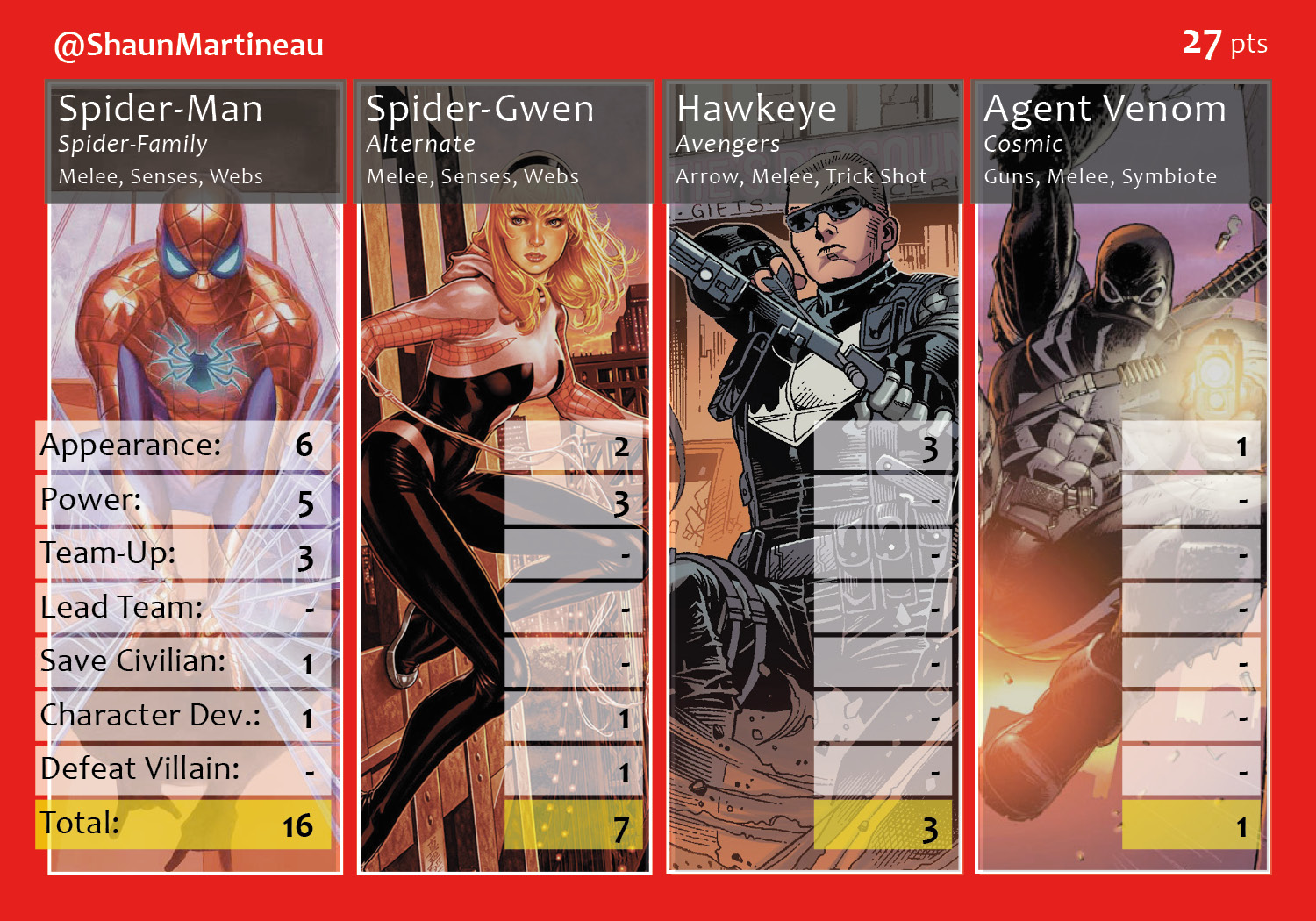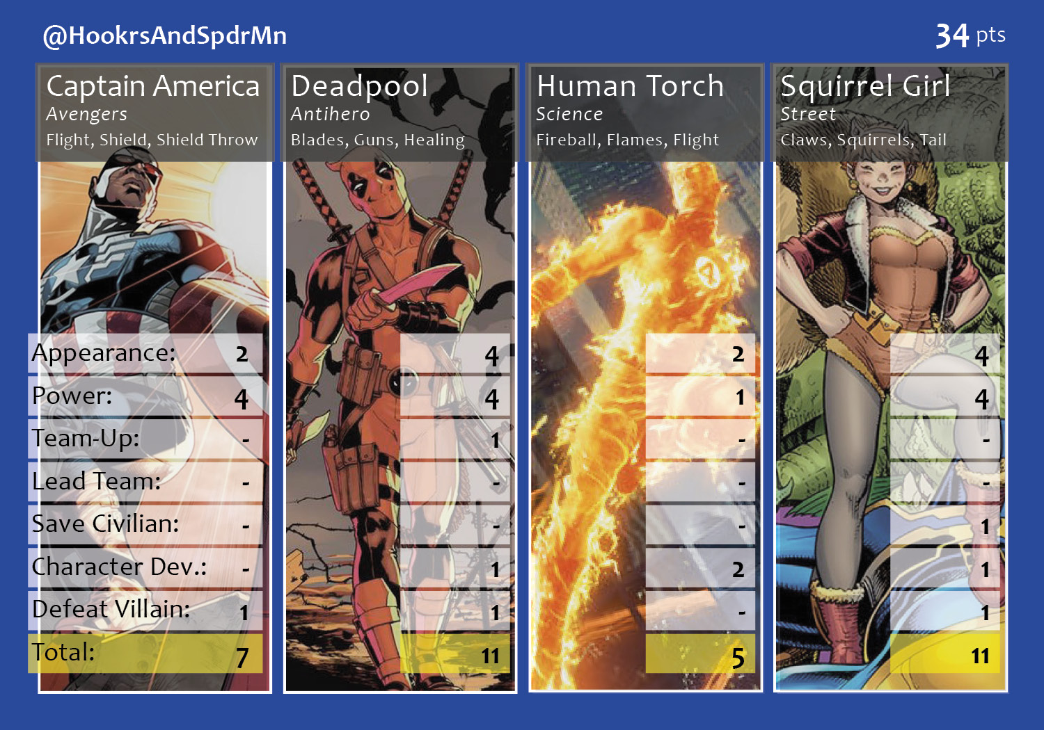A new season of the Fantasy Comic League begins. This round introduces a fourth participant, @dirtylash, and closely reflects Marvel’s All-New, All-Different marketing campaign. Squirrel Girl heads up the new additions to the league and her 11 points help Brian secure a first place finish. Spider-Man, and his 16 points in six appearances, proves why he was the hands-down number one overall draft pick for Shaun. Johnny battles it out with the newcomer to avoid a last place finish, but loses the tiebreaker when Iron Man scored more individual points for Lash’s team. Other new characters making their first appearance include Human Torch, Agent Venom, Ms. Marvel, Sunspot and Brother Voodoo. Make sure to follow along with Podcast Episode 55 – Make Captain America Great Again for a full breakdown of points.