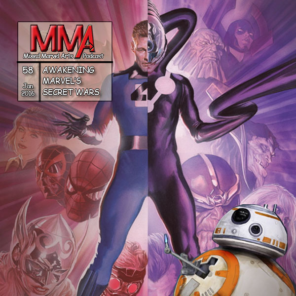 The Mixed Marvel Arts Podcast goes to war! Brian negatively dwells on recent, tragic events in the real world, while Shaun attempts to be more of an optimist and believes “Everything Lives!” The duo respectively embody the dark and the light; Brian’s Dr. Doom/Kylo Ren to Shaun’s Reed Richards/Finn. But both agree that Marvel’s Secret Wars comic event and Disney’s Star Wars: The Force Awakens are worthy of their critical acclaim. Episode artwork: Alex Ross, Secret Wars #3 cover; BB-8 from Disney’s Star Wars.