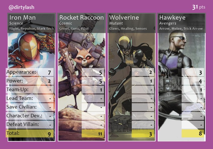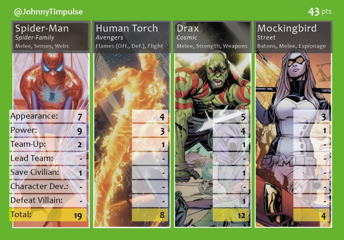 The All-New, All-Different Avengers assembled for Brian and delivered him his second straight victory. Johnny continued his slow crawl up the ladder and Lash remained in the cellar. Shaun’s unorthodox approach to the draft earned him third place and introduced Howard the Duck and Adam Warlock to the league. The rookies only managed 15 points between the two of them for Shaun’s team, but individually they outpaced the five points for Brian’s Ms. Marvel and the four points for Johnny’s Mockingbird. Lash suffered from the All-New Wolverine’s uncharacteristic three-point finish. Marvel’s flagship odd couple, Spider-Man and Deadpool, took the top two spots for the month with 19 and 18 points, respectively.