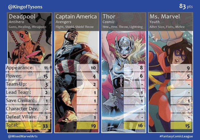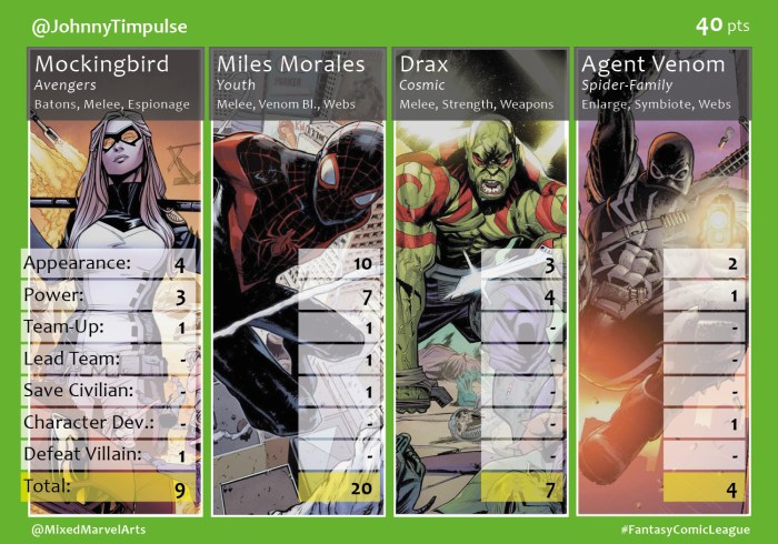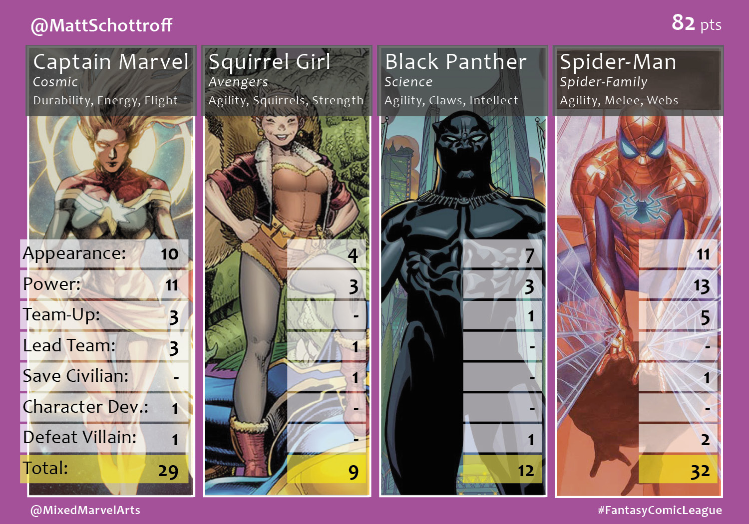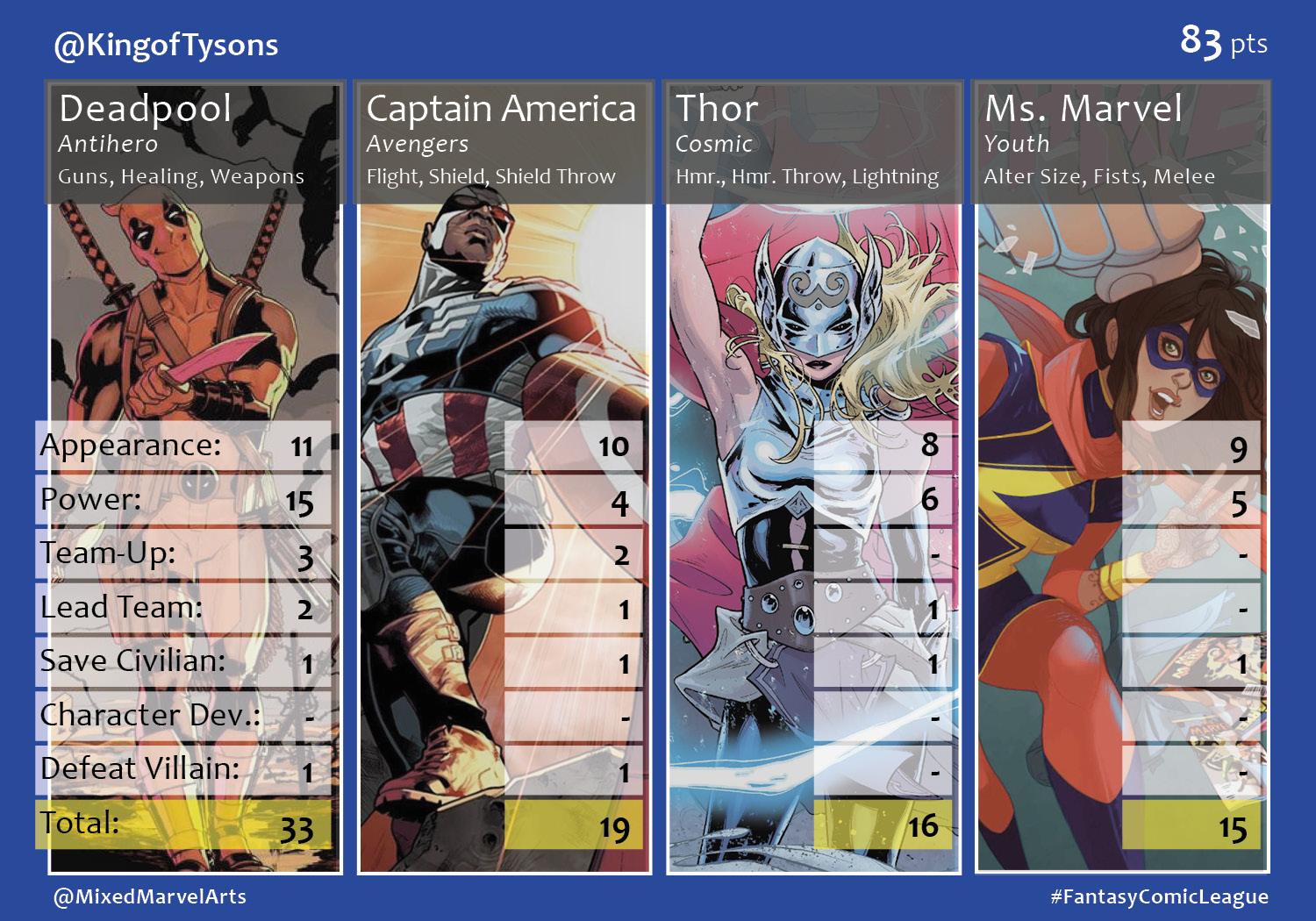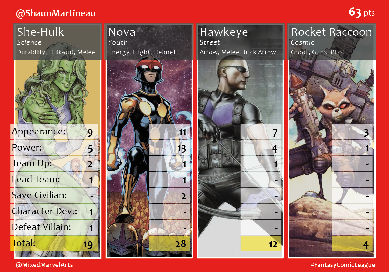 Iron Man continued to sore in the Fantasy Comic League and scored the most individual hero points for the second month in a row. Thanks to the events of Civil War II, and a five-week month, Tony tallied a record-breaking 44 points – the most points scored by one character in a single month. Unfortunately, Iron Man’s heroic 16-appearance effort, and scoring at least one point in every category, was not enough for swampy, as a subpar showing from the Punisher brought his team down to a third-place finish. Brian’s typical trio of well-rounded, All-New, All-Different Avengers earned him a first place finish when led by Deadpool’s 33 points, which was a monumental score in its own right. After finishing in last place in May, Matt drafted the dependable Spider-Man and benefited from his 32 points, slightly ahead of his surging Captain Marvel, 29 points. Shaun cobbled together a new team based around Nova, 28 pts, and She-Hulk, 19 pts, which proved good enough to beat Johnny’s typical roster of single-digit point-scorers.