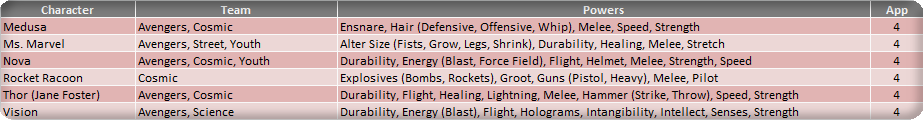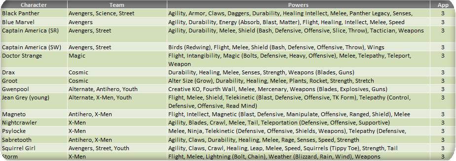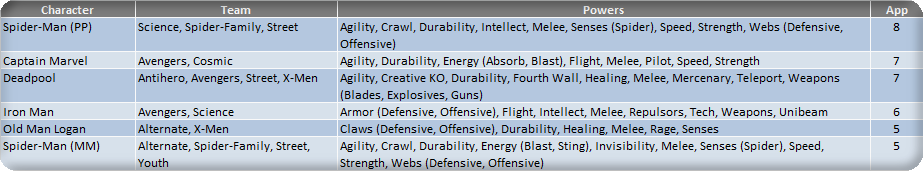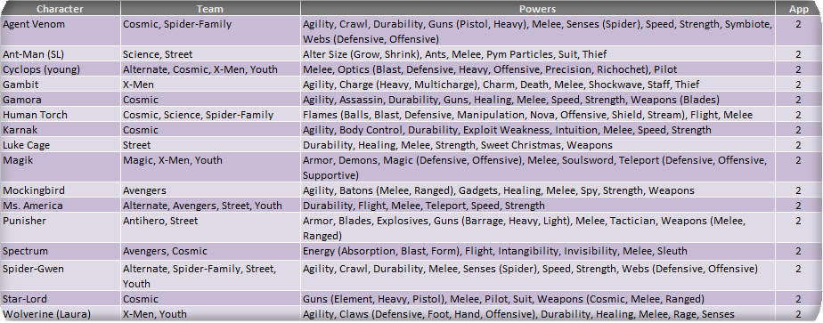 The third and final season of the 2016 Fantasy Comic League begins in September. In an effort to improve the process of sharing the Fantasy Comic League with the Mixed Marvel Arts community, we have compiled a set of hero tiers based on presumed September appearances. These appearance estimates are based on comic solicitations and cover artwork previews provided by the Marvel Database wiki. Character names, team designations and power sets are revised to conform with the most current information found on the Database. Power designations have also been simplified for easier classification and choice, providing the majority of the heroes with 9 to 11 eligible powers from which to choose. As a reminder, you may only have one hero per team designation on your roster and are allowed to select three powers from the heroes’ power set. Powers in (parenthesis) are a subset of the overall ability and can be selected as well as the generic use of that power. For example, Deadpool (a Tier 1 hero) can be drafted as any of his four team classifications and can use Weapons, Blades and Guns as his three powers (Blades and Guns being a subset of the overall Weapons skill).