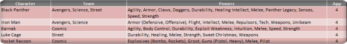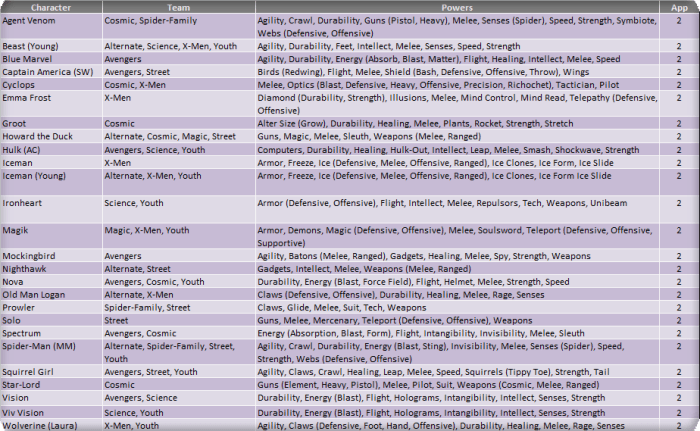 These appearance estimates, based on comic solicitations and cover artwork provided by the Marvel Database wiki, are meant as a guideline and not an indication of a specific draft order. Character names, team designations and power sets conform to the most current information provided by the Database. Power designations are simplified for easier classification and choice, providing the majority of the heroes with 9 to 11 eligible powers from which to choose. As a reminder, you may only have one hero per team designation on your roster and are allowed to select three powers from the heroes’ power set. Powers in (parenthesis) are a subset of the overall ability and can be selected as well as the generic use of that power. For example, Deadpool (a Tier 1 hero) can be drafted as any of his four team classifications and can use Weapons, Blades and Guns as his three powers (Blades and Guns being a subset of the overall Weapons skill).