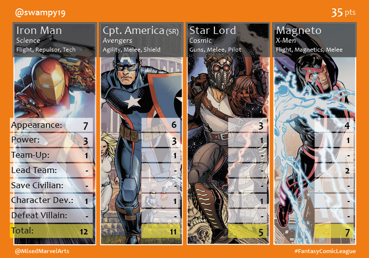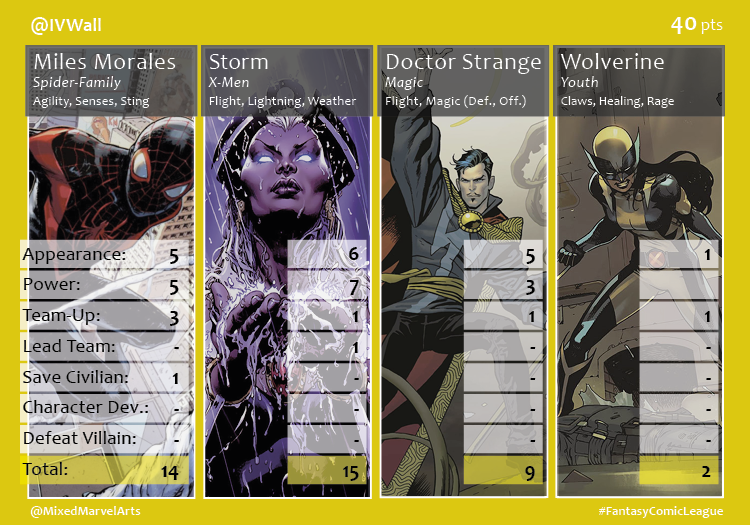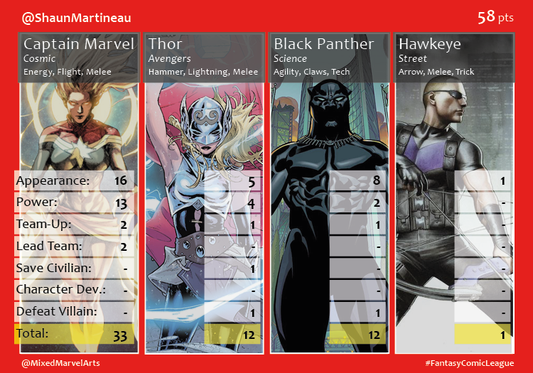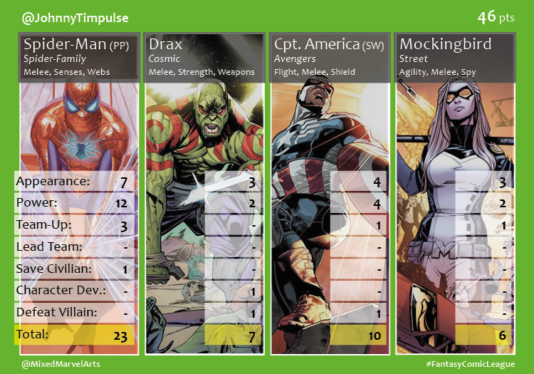 The third season of the 2016 Fantasy Comic League began the same way the second season had ended. Shaun tapped into Captain Marvel’s dominate Civil War performance to triumph over the rest of the participants. Carol and Black Panther, her Ultimates teammate, joined to score 45 of Shaun’s 58 points. Johnny used Spider-Man’s 23 points to edge out Brian when their two teams tied at 46 points. Medusa, Captain Marvel’s Civil War gal pal, was a strong factor in Matt’s fourth place finish. Newest Fantasy Comic League member, Sceritz (@IVWall), brought Storm back to the League and she showed her appreciation by earning a 15 point month. Swampy’s buddy comedy-like team led by Tony Stark and Steve Rogers was only good enough for a 35 point finish.