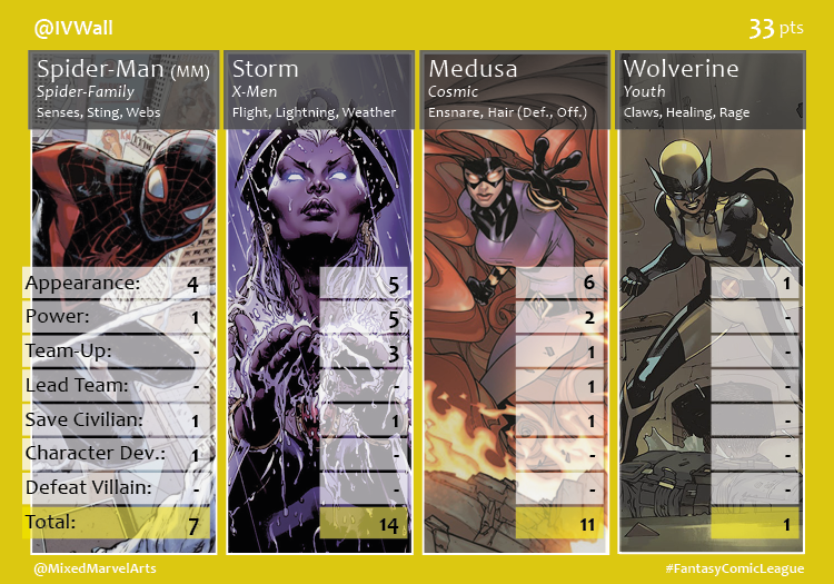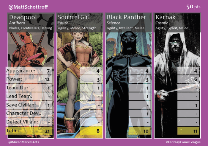 Deadpool is back in black and on top of the Fantasy Comic League’s most valuable character list! Matt (50 points) benefited from Deadpool’s 21-point month, but also exploited the league’s indifference to Karnak. The oft overlooked Inhuman scored a modest 11 points in his league debut, helping Matt score the monthly victory. Shaun (37 pts) successfully recovered from losing his whole team in the previous month, thanks in large (and small) part to Scott Lang’s big third week. Another rookie to the league, Ant-Man scored a double-digit tally in support of Shaun’s Doctor Strange-led team. Doubling down on Queens proved beneficial to Sceritz (33 pts) as Storm and Medusa raised him to third place. A dialogue-heavy Civil War issue resulted in a subdued Captain Marvel and Iron Man at Swampy’s expense (32 pts). Luke Cage’s sweet debut in the Fantasy League was not enough to bolster Brian’s (31 pts) team, nor could Peter Parker’s typical top-tier performance save Johnny (28 pts) from the bottom of the barrel.