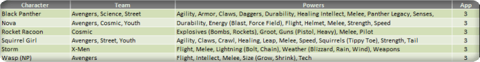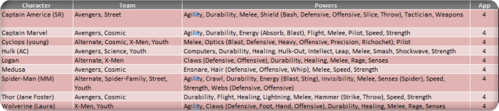These appearance estimates, based on comic solicitations and cover artwork provided by the Marvel Database wiki, are meant as a guideline and not an indication of a specific draft order. Character names, team designations and power sets conform to the most current information provided by the Database. Power designations are simplified for easier classification and choice, providing the majority of the heroes with 9 to 11 eligible powers from which to choose. As a reminder, you may only have one hero per team designation on your roster and are allowed to select three powers from the heroes’ power set. Powers in (parenthesis) are a subset of the overall ability and can be selected as well as the generic use of that power. For example, Deadpool can be drafted as any of his four team classifications and can use Weapons, Blades and Guns as his three powers (Blades and Guns being a subset of the overall Weapons skill).