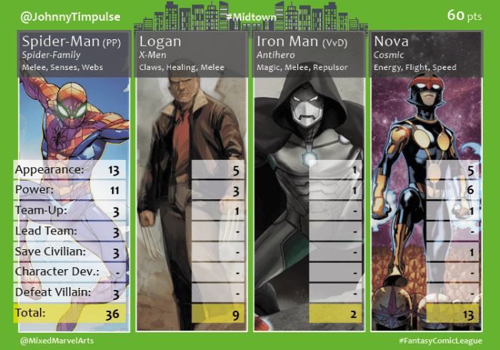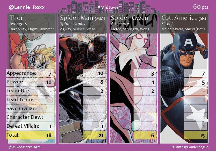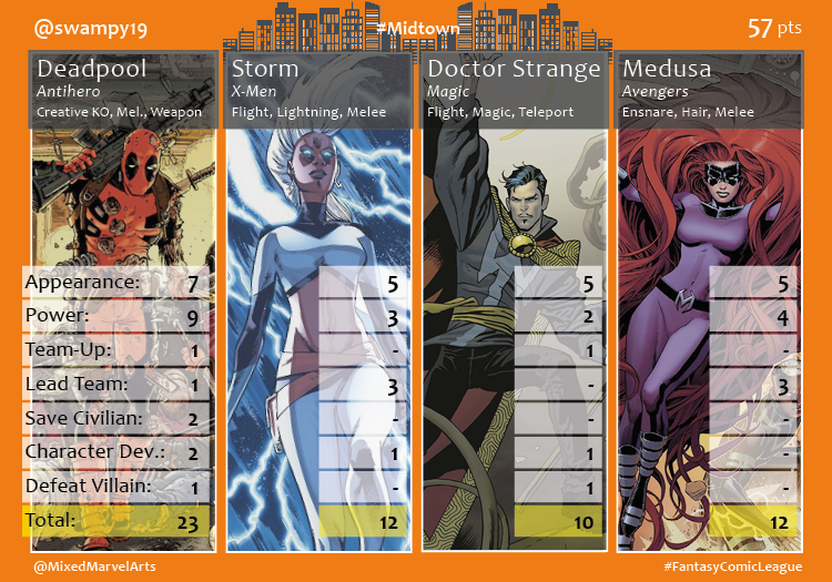 The world is under attack by Hydra! Luckily, S.H.I.E.L.D. has dispatched a team of agents to help secure the war zones. Each agent has recruited a team of superheros to help them patrol the areas and quell the rising chaos. Led by Agent @KingofTysons (bet you didn’t know the ‘@’ symbol stood for agent) and his team of youthful Champions (68 points), the Midtown crew saved 13 civilians and defeated nine major threats to the city while totaling 289 points. Spider-Man, Peter Parker, picked up the slack for @JohnnyTImpulse (60 pts) as Victor Von Doom struggled to capitalize on his new heroic lifestyle. New agent @Lennie_Roxx (60 pts) enlisted potential ‘love-spiders,’ Miles Morales and Gwen Stacy for a strong third place finish. @swampy19 (57 pts) called upon two of Marvel’s feuding queens, Storm and Medusa, but only managed a fourth place finish. Rookie agent @robertcyoung (44 pts) banked on two normally productive heroes, Captain Marvel and Black Panther, but their below average month resulted in a last place finish for the newbie.