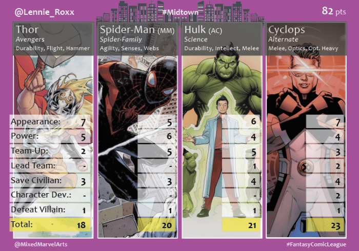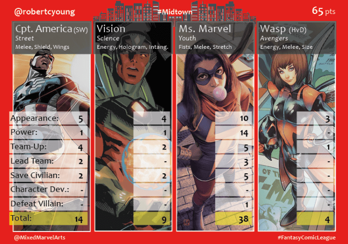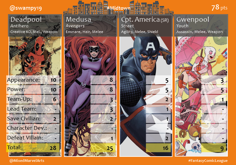 Midtown continued to be torn apart by Monsters and Clones while the Inhumans and X-Men remained at each other’s throats. Despite a short month, the Midtown Agents navigated a quagmire of events to team up with other heroes, save 45 civilians and earn 377 points! Agent @JohnnyTImpulse was bolstered by Spider-Man’s strong second half of the month and led his division with 83 points. Agent @Lennie_Roxx (82 pts) enlisted three of the Champions and earned a close second place finish. Agent @swampy19 (78 pts) welcomed Gwenpool to the Midtown division, but her nine points failed to match the strong performances of his other heroes. After his first place finish in January, which required him to relinquish his heroes, Agent @KingofTysons (83 pts) only slightly recovered to avoid last place. And despite recruiting the division-leading Ms. Marvel, Agent @robertcyoung (78 pts) and his team of Avengers failed to break out in February.