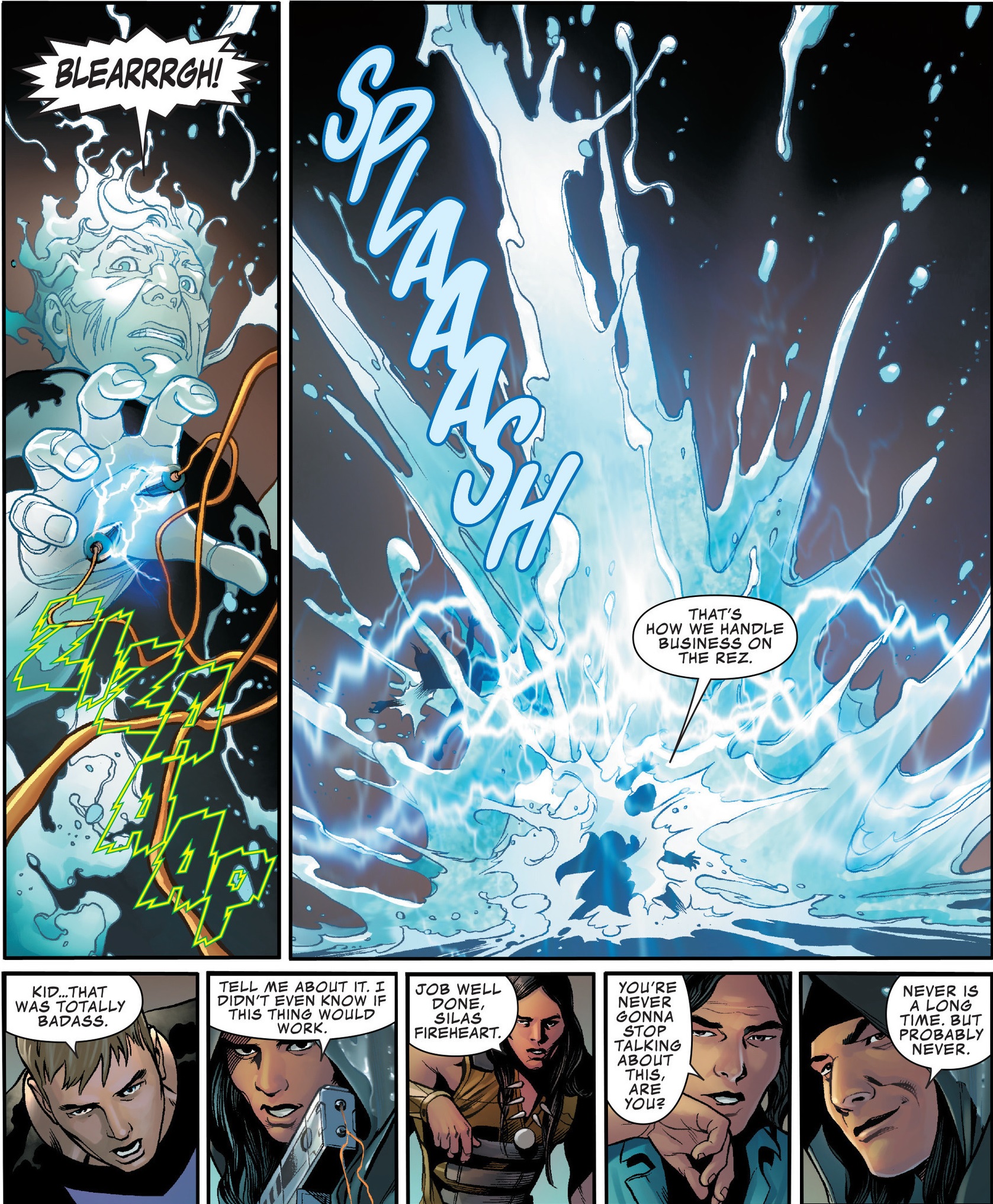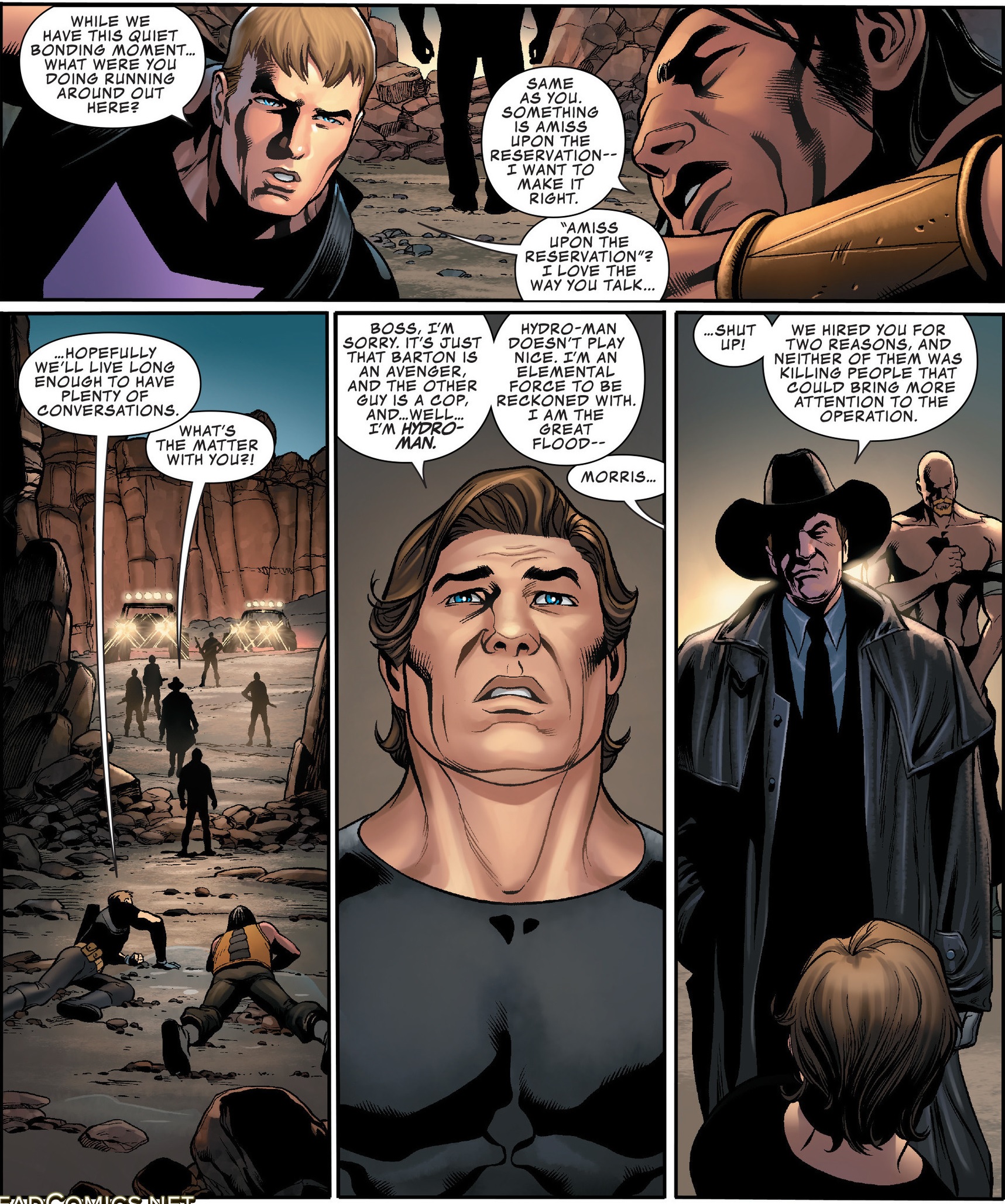 Walker’s script is super tight. Few people can wax poetic in comics quite like Jonathan Hickman, but there is an elegance to Walker’s writing. His script has a lot to say and it does so without hijacking the story or abandoning characterization. Two characters who only appear for a couple sequences are well characterized, largely in part to the ideological views Walker gives them. Red Wolf is especially well characterized and given a view on life we do not often see in comics. He is yet another man out of time with whom Clint butts heads, but their dynamic is informal and humorous. The contrast between what the characters are is interesting, especially how each justifies their reason for going on. Walker also employs the perfect villain for this opening story about water pollution: Hydro-Man.