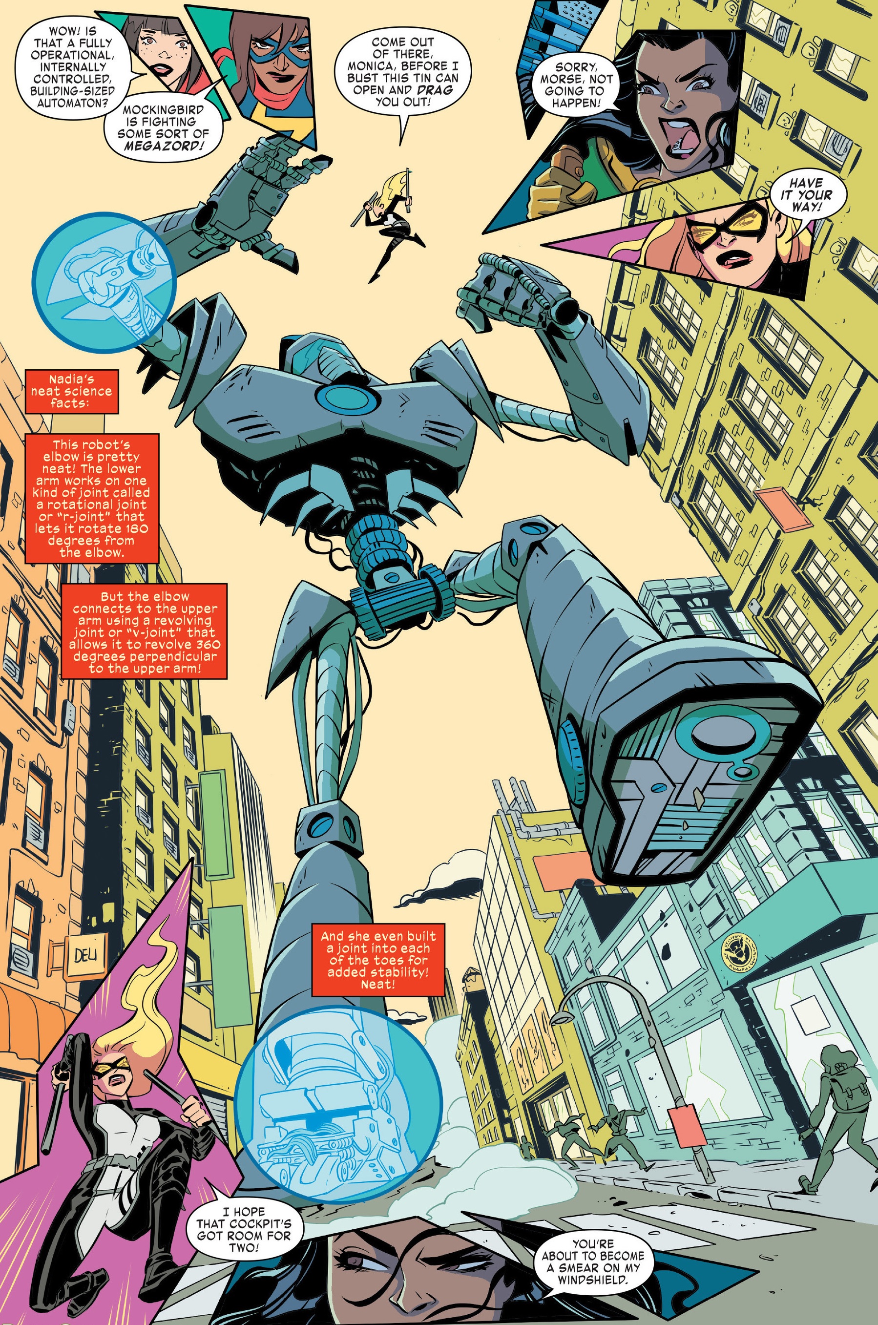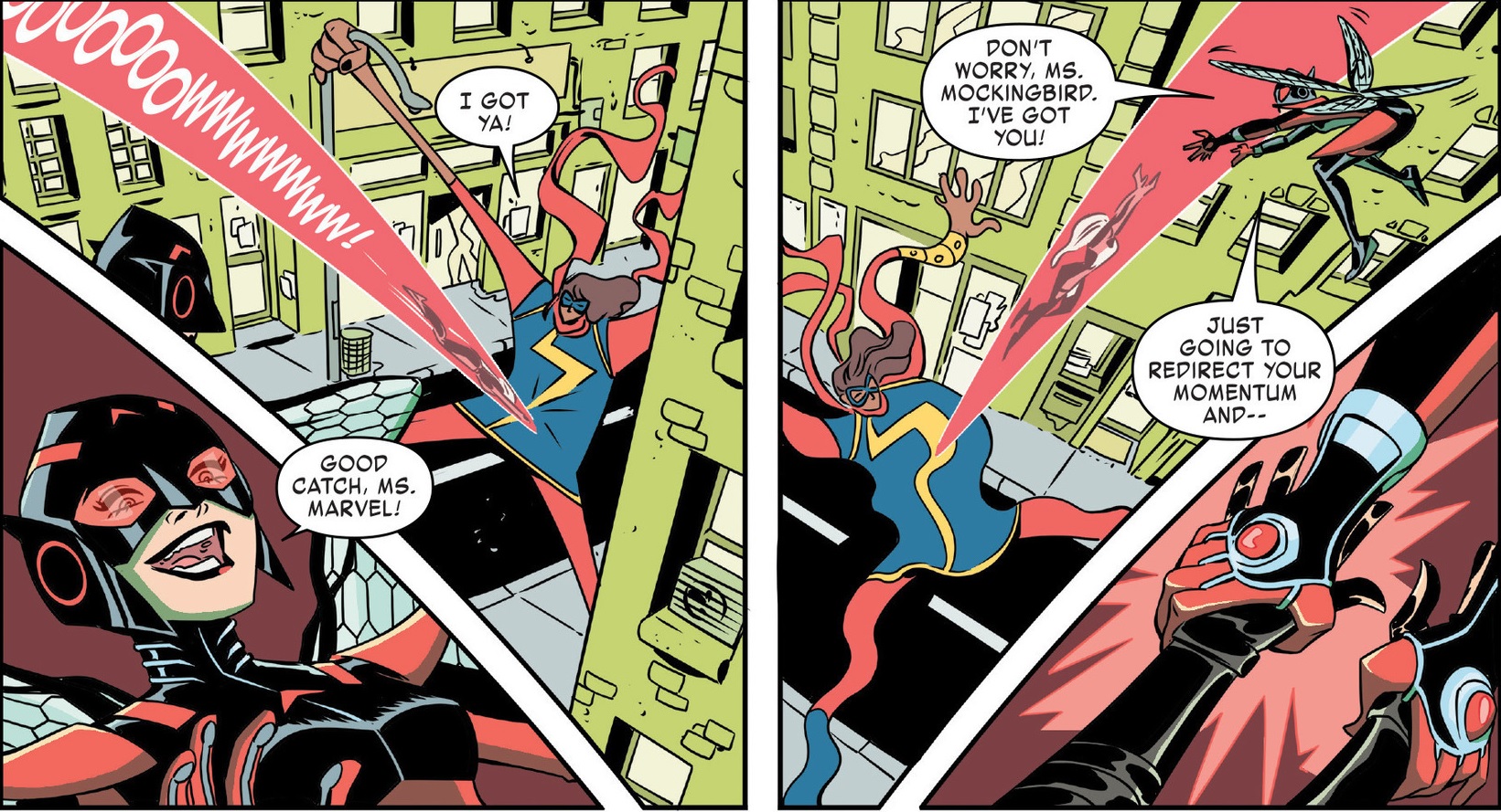I’m Going To Make Them Rethink That Whole List: Unstoppable Wasp is Elsa Charretier’s first ongoing Marvel gig and at times it shows. But she uses her pages well, creating panels with creative and unconventional framing. During her fights she uses a style similar to Gerardo Sandoval’s paneling, which cuts to specific details or characters over a background drop of the fight. Condensing figures is another aspect Charretier could improve on, but there is some notable improvements between the first fight with Ms. Marvel and Mockingbird, and Nadia’s later fight against Poundcakes and Letha. Ms. Marvel is an excellent choice for the first guest star, as it allows Charretier to use her loose anatomy in effective ways. There is a lot of personality to Charretier’s art, in the background and especially the wardrobes. While Charretier has work to go with all the emotions, she has no problems with joy and it leaps off the pages. An element that helps that is Megan Wilson’s colors. While there is an overabundance of simple monotone backdrops, the colors really help sell the mood of scenes both joyous and dour. Wilson also does a good job with shadows in the series. One thing the artistic team is unable to do is make Mockingbird’s mask work; that thing really needs to go.