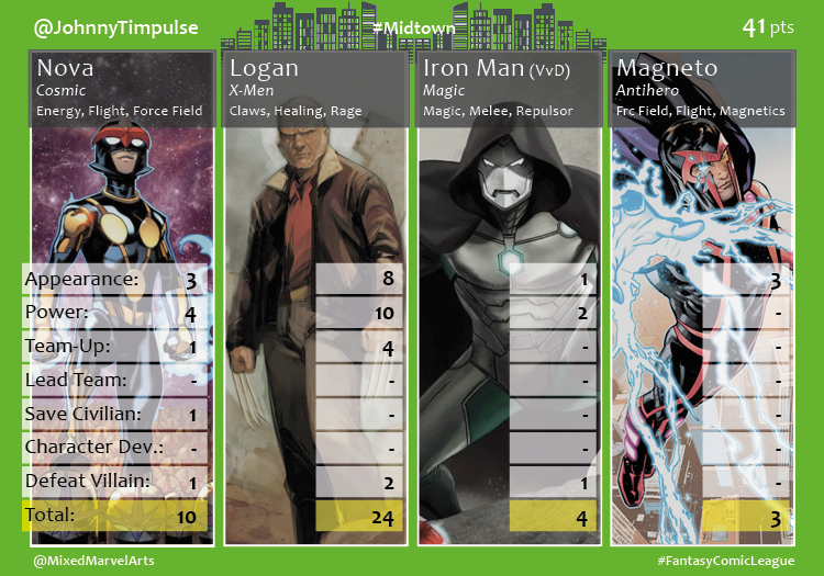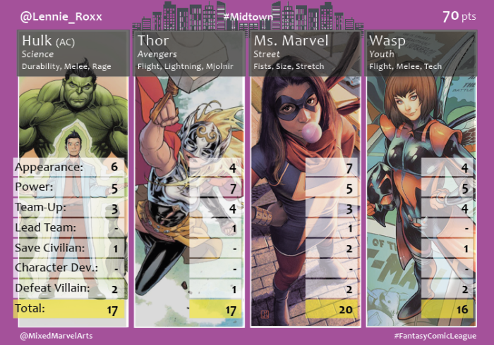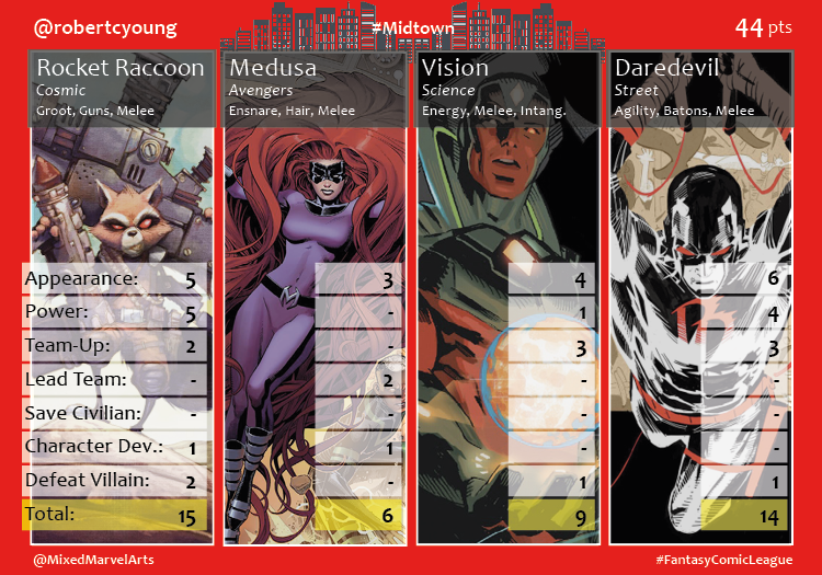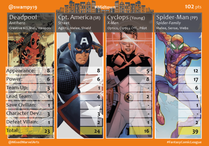The current threat to Midtown ended after the #FantasyComicLeague agents successfully fended off Deadpool’s ex-wife’s army of demons! The Merc with a Mouth, despite being served with divorce papers, was the only hero to hit for the cycle in the month of April, while Steve Rogers, Peter Parker, Peter Quill and Kamala Khan were a category short of performing the same feat. Overall, the #Midtown division dipped in the number of civilians saved (7) compared to the previous month, but defeated a lot more antagonists (25). The heroes experienced 10 character defining moments and earned 317 points! Agent @swampy19 (102 pts) led the charge for Midtown after he miraculously managed to draft Spider-Man to team with Deadpool, although swampy just missed out on beating the monthly #FantasyComicLeague record. Agent @Lennie_Roxx (70 pts) had another successful month with her somewhat recurring characters of Hulk and Thor. Agent @KingofTysons needed at least a third or fourth place finish to secure an overall win, and he managed to earn that with a 60 point finish. Agent @robertcyoung (44 pts) followed up his best month by reacquiring Vision but the recently reliable Medusa fell a bit short for him. Agent @JohnnyTimpulse (41 pts) kept his team of favorites absolutely the same from the previous month and finished in the same spot as before.