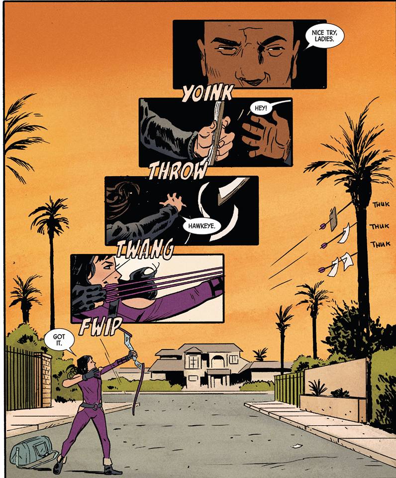 The artistic hallmarks of the Hawkeye series begin to emerge as well. In addition to a plethora of reaction shots, we also see the return of the eighteen panel grid sequence and Kate’s Hawk-Vision. The Hawk-Vision begins to bleed together with Kate’s inner dialogue, which is best seen in a party where Kate is identifying people as “the guy from that movie” or “whatsherface from the commercial”. One feature I really like with the Hawk-Vision is that something Kate notices in the background in the beginning of a story will often come back as something important later on; it is a neat feature for a detective book that feels intrinsic to the titular character.