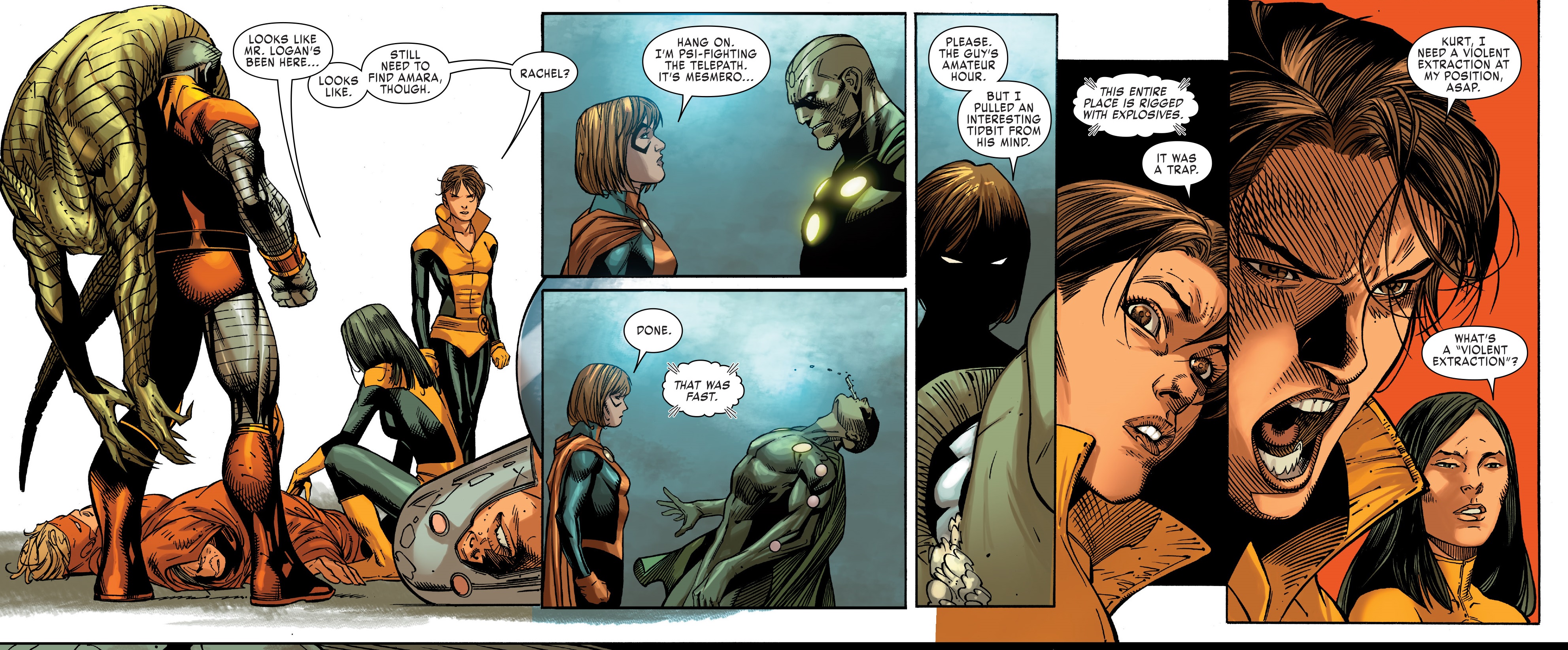 Back aboard the X-jet, they have about 30 seconds to get Kitty and Amara but Kitty realizes there is no time left and tells Kurt to leave them behind. Colossus watches on in horror as the facility explodes but Kitty’s phasing abilities save herself and Amara. We return to Central Park where SHIELD is picking up the members of the brotherhood, except for the new Brood guy who Kitty plans to interrogate. The X-Men debrief in the mansion where Rachel lets them know that she found out who is actually pulling the strings for Mesmero.