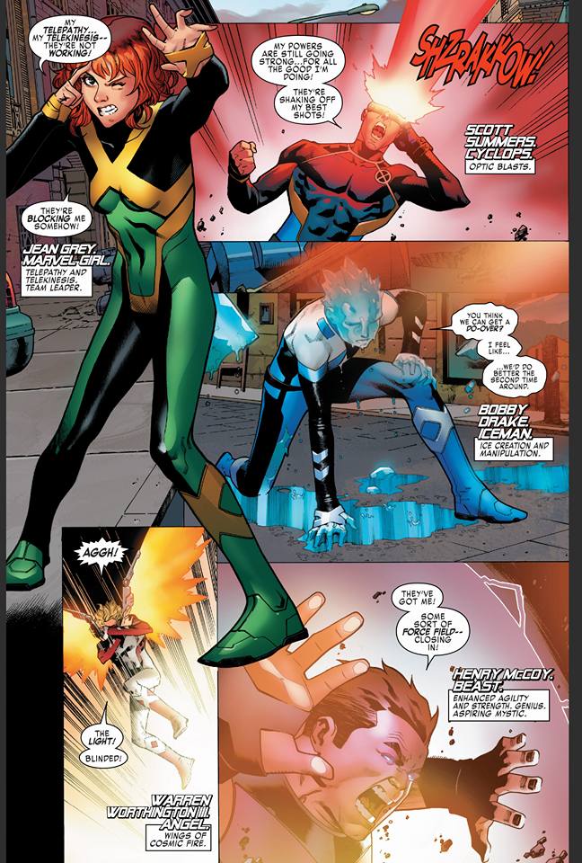 Recap and Thoughts: As of last issue, the team got to Barcelona and saw that the Sentinels were not trying to fight them but they still don’t trust them. The original five initiate a fight, but soon realize that none of their attacks are working and a young Spanish girl named Belen, asks them to stop. She tells them that the Sentinels were helping her when her newly emerged powers went off the rails. The Sentinels tell them that they are not to be harmed and ask them to come with them as they want to show that they are working towards the same goal; helping mutantkind.