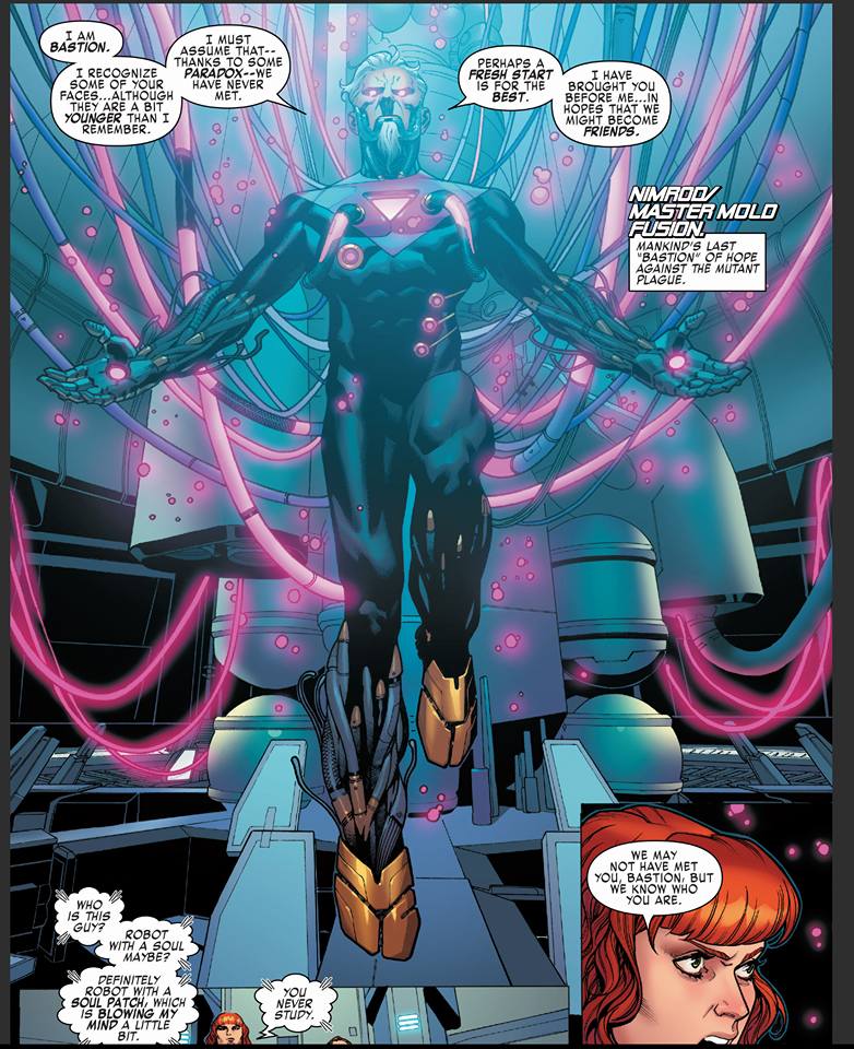 The original five are hesitant so the Sentinels take them by force. En route, Belen and Jean have a chat where Belen explains how her powers developed; what started as a simple headache quickly escalated. Somehow the Sentinels now have power dampening abilities; wow, why did the X-writers never think of that before? Jean gives Belen a crash course on Sentinels and how utterly terrifying it was for her to face them. They get brought to a mysterious place and the Sentinels turn their power dampeners off before revealing their mastermind. And Holy Operation: Zero Tolerance, it is none other than Bastion.