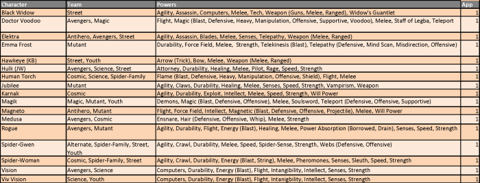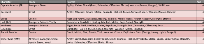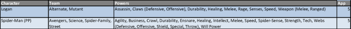 These appearance estimates, based on comic solicitations and cover artwork provided by the Marvel Database wiki, are meant as a guideline and not an indication of a specific draft order. Character names, team designations and power sets conform to the most current information provided by the Database. Power designations are simplified for easier classification and choice, providing the majority of the heroes with 9 to 11 eligible powers from which to choose. As a reminder, you may only have one hero per team designation on your roster and are allowed to select three powers from the heroes’ power set. Powers in (parenthesis) are a subset of the overall ability and can be selected as well as the generic use of that power. For example, Deadpool can be drafted as any of his four team classifications and can use Weapons, Blades and Guns as his three powers (Blades and Guns being a subset of the overall Weapons skill).