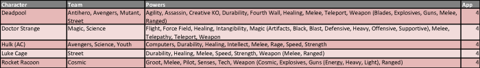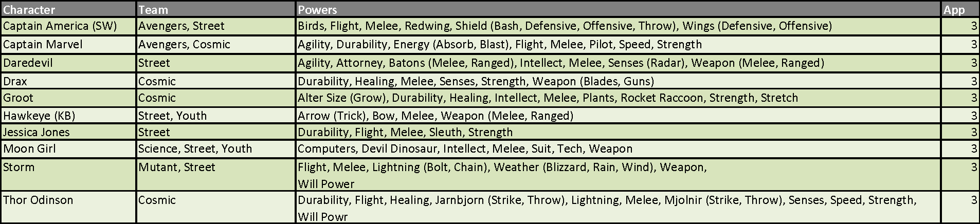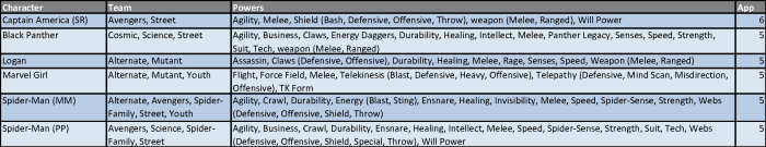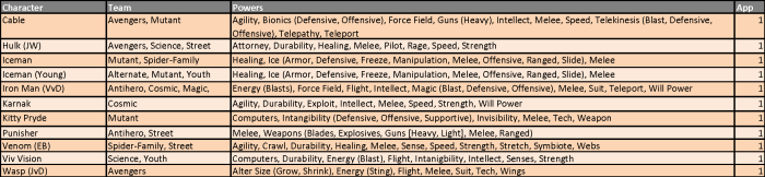 These appearance estimates, based on comic solicitations and cover artwork provided by the Marvel Database wiki, are meant as a guideline and not an indication of a specific draft order. Character names, team designations and power sets conform to the most current information provided by the Database. Power designations are simplified for easier classification and choice, providing the majority of the heroes with 9 to 11 eligible powers from which to choose. As a reminder, you may only have one hero per team designation on your roster and are allowed to select three powers from the heroes’ power set. Powers in (parenthesis) are a subset of the overall ability and can be selected as well as the generic use of that power. For example, Deadpool can be drafted as any of his four team classifications and can use Weapons, Blades and Guns as his three powers (Blades and Guns being a subset of the overall Weapons skill).
