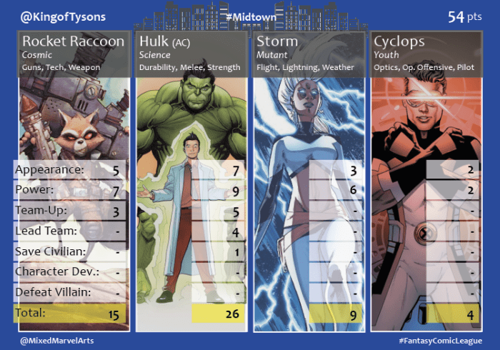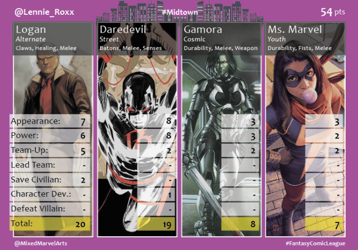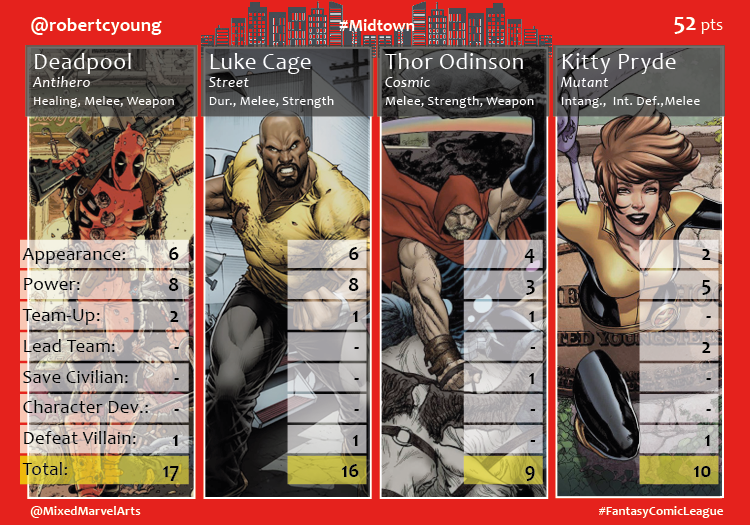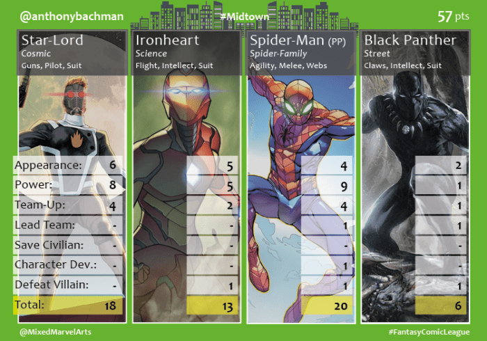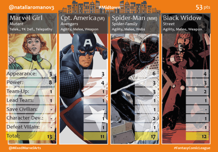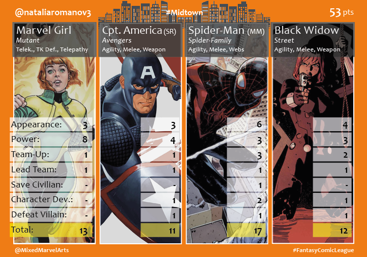 Every participant of the Midtown Fantasy Comic League division brought their A-game in July which resulted in one of the closest, hardest fought months of the league. A mere five points separated first place and last place as the Midtown #FantasyComicLeague Agents continuously battled to separate themselves from the rest of the pack. Their combined might resulted in 270 points, with nine antagonists thwarted, five civilians saved and six character defining moments. In the end, Agent @anthonybachman prevailed thanks to Black Panther’s final week. Bachman scored 57 points, with his two Peters (Spider-Man and Star-Lord) earning him 20 and 18 points. The Totally-Awesome Hulk stood out with 26 points, the strongest individual hero performance, and helped Agent @KingofTysons break a tie for second place at 54 points. Daredevil appeared in the most comics for an individual character (eight) for the second month in a row, this time to Agent @Lennie_Roxx‘s benefit, who also tallied 54 points. Black Widow propelled Agent @nataliaromanov3 into contention with a 53-point finish, thanks in large part to her performance in the final week, which featured the biggest character defining moment of the month. Despite the last place finish for Agent @robertcyoung, he was consistently in the running with strong performances from Deadpool and Luke Cage, but his 52 points fell just short of snagging him an overall placement point.