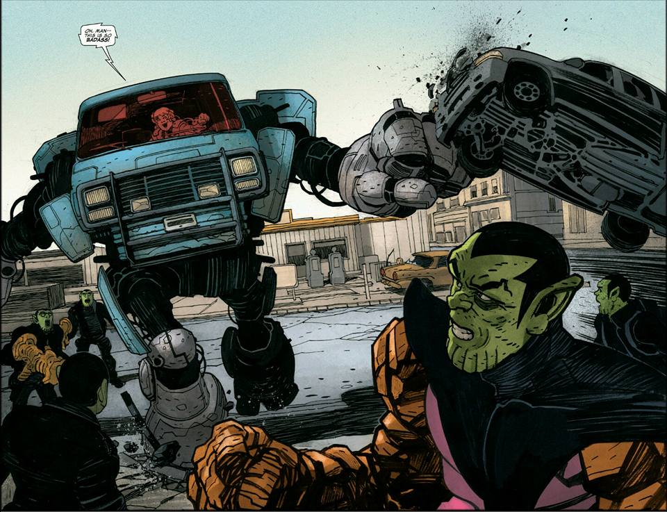 Just because I’m stuck sitting, doesn’t mean I can’t take a stand: The first arc of Occupy Avengers was a politically charged adventure that brought two unlikely allies together on a mission to rediscover themselves. The second arc served as more of a clean up for the cancelled Nighthawk series, recruiting a character that writer, David F. Walker has a fondness for. Thankfully, this third arc returns to the politically charged status of the series, focusing on Skrull immigrants seeking political asylum from their empire, simply for desiring to live a peaceful life. This arc is about the extents people will go to fight for what they believe in, including our new team recruit, Wheels Wolinski, a paraplegic who has to overcome his own mindset before he can overcome his disability. He has an unexpected ally in a sentient van (nicknamed Vantastic by Hawkeye) that is a mixture of the TARDIS and Voltron. This story does a great job of showing us the perspectives of each team member, as well as several members of the Skrull asylum seekers. Our first issue is narrated by a particularly aggressive member of the Skrull community, but it allows us to jump into the heart of the conflict early on and compare the rest of the community against him. While two sides of this three sided conflict are well defined, the villains suffer in comparison; all we really learn is they are religious zealots from the Skrull empire. Walker does a good job of creating chaos, because even though we are kept in the know on all sides of the conflict, no-one at any point fully knows what is going on and we hear false accusations passed around between characters to deceive us. It is tricky to keep the audience in the know and also be able to deceive them, but Walker pulls it off. Walker is also able to create stakes even if our heroes never feel too at risk. The first issue introduces a target, Iris the waiter, someone to be saved by our heroes, and yet the first issue ends with her death, with several others killed on the way. As the stakes rise for the Skrulls, tension rises for our heroes.
