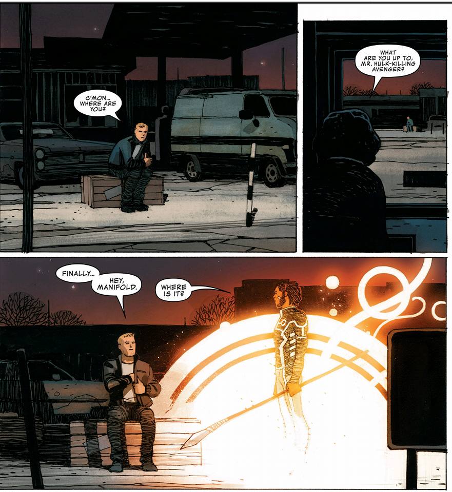 Colorist Jordie Bellaire and letterer, Clayton Cowles, do a lot to bring Walta’s work to life. Cowles lettering and sound effects reflect the actions going on in the world; the SMAASH of glass breaking is fractured into pieces similarly to the window. And Bellaire makes everything come alive, from little things like luminescent car lights and the sun reflecting off Clint’s purple aviators, to the big ever changing sky-scape. The alien energy that come forms their guns pops off the page, while the inside of Vantastic is an unnatural red that really heightens the Akira-esqe feeling I get from those panels. Perhaps the most brazen moment is when Eden Fesi cameos to ferry Wheels to Clint’s side, which is unlike any other scene in the comic. My one complaint is the inconsistency with Skrull blood; some bleed green and some bleed red.