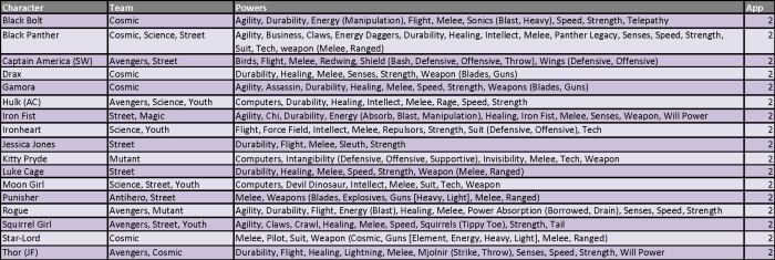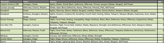 These appearance estimates, based on comic solicitations and cover artwork provided by the Marvel Database wiki, are meant as a guideline and not an indication of a specific draft order. Character names, team designations and power sets conform to the most current information provided by the Database. Power designations are simplified for easier classification and choice, providing the majority of the heroes with 9 to 11 eligible powers from which to choose. As a reminder, you may only have one hero per team designation on your roster and are allowed to select three powers from the heroes’ power set. Powers in (parenthesis) are a subset of the overall ability and can be selected as well as the generic use of that power. For example, Deadpool can be drafted as any of his four team classifications and can use Weapons, Blades and Guns as his three powers (Blades and Guns being a subset of the overall Weapons skill).