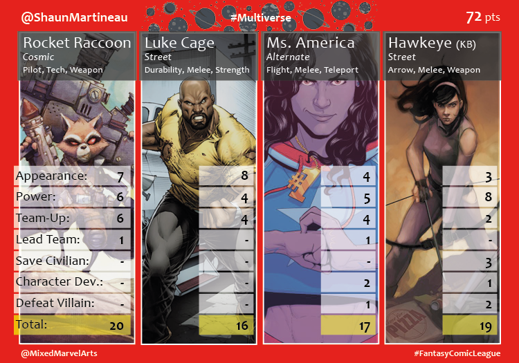 I would like to take this moment to dedicate this win to my girls, Kate Bishop and Nadia Pym, as well as the one consistent addition to my team; Rocket Raccoon. They may not be 30 point tyrants, but they consistently delivered and kept my team floating above the rest.