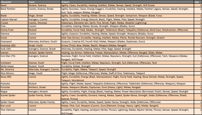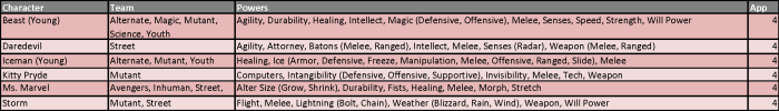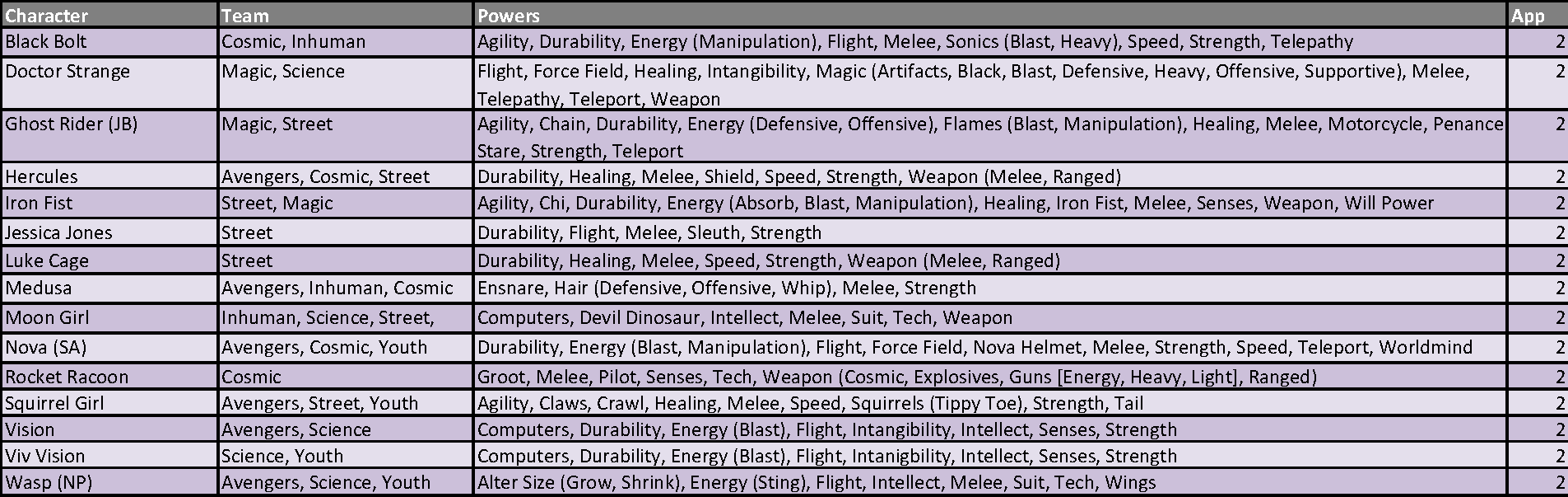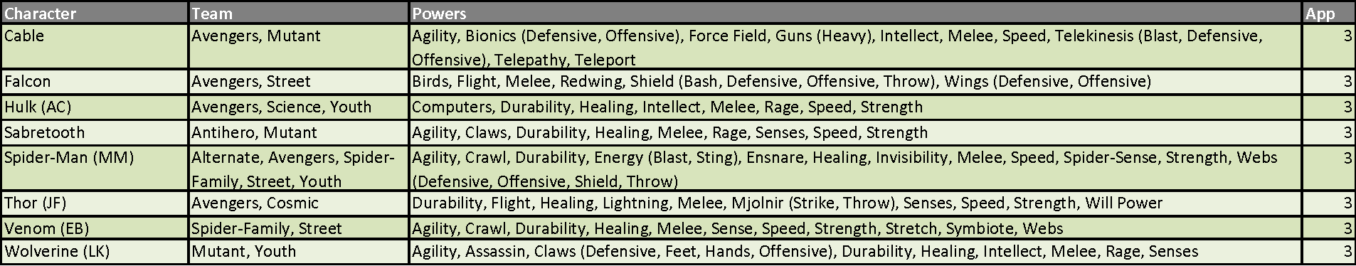 These appearance estimates, based on comic solicitations and cover artwork provided by the Marvel Database wiki, are meant as a guideline and not an indication of a specific draft order. Character names, team designations and power sets conform to the most current information provided by the Database. Power designations are simplified for easier classification and choice, providing the majority of the heroes with 9 to 11 eligible powers from which to choose. As a reminder, you may only have one hero per team designation on your roster and are allowed to select three powers from the heroes’ power set. Powers in (parenthesis) are a subset of the overall ability and can be selected as well as the generic use of that power. For example, Deadpool can be drafted as any of his four team classifications and can use Weapons, Blades and Guns as his three powers (Blades and Guns being a subset of the overall Weapons skill).