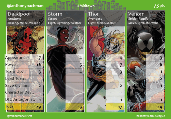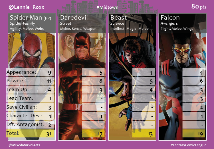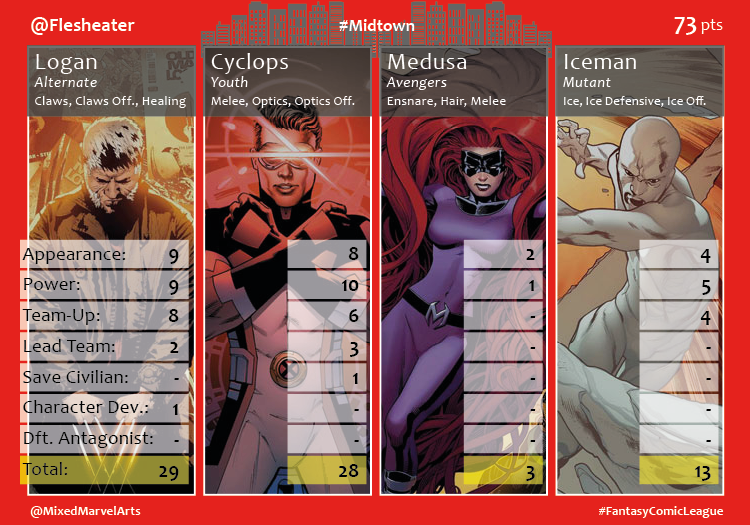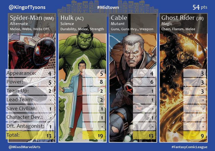 World’s collided in the month of October when Mojo and the High Evolutionary each unleashed diabolical plans to overpower and trap Earth’s mightiest mutants and Avengers. The agents of the Midtown #FantasyComicLeague division heavily recruited the heroes at the center of the chaos to stop the invaders. The X-Men Blue and Gold teams joined forces against Mojo’s latest malevolent broadcast, while the Avengers and Champions teamed up to confront the High Evolutionary’s herald. The Midtown team scored 350 combined points thanks in large part to the 66 team ups between the heroes. Midtown saved 16 civilians, up from the previous month, but saw a decline in the number of antagonists defeated (7) and character defining moments (7), most likely due to the crossovers just beginning. Agent @Lennie_Roxx had a big month. She took first place with 80 points, 31 of which came from the top performing hero, Spider-Man, and then she ended the month by giving birth to her first-born son! Congratulations! Peter Parker was the only character to hit for the Fantasy cycle in October. Agent @Flesheater and Agent @anthonybachman engaged in a month-long back and forth competition, which saw Flesheater come out on top in the end. Both agents earned 73 points, and the top hero for both participants scored 29 points. Cyclops, who had one of his best months thanks to his allegiance to both the X-Men and Champions, broke the tie in Flesheater’s favor with 28 individual points. Agent @nataliaromanov3 recruited three leading ladies from the teams involved in the crossovers. They propelled her into contention with a big final week, but her 70 point finish fell just short in the end. Agent @KingofTysons never really had a chance this month despite drafting Miles Morales and Amadeus Cho. His reliance on two league amateurs, Cable and Ghost Rider, kept him at the bottom with 54 points.