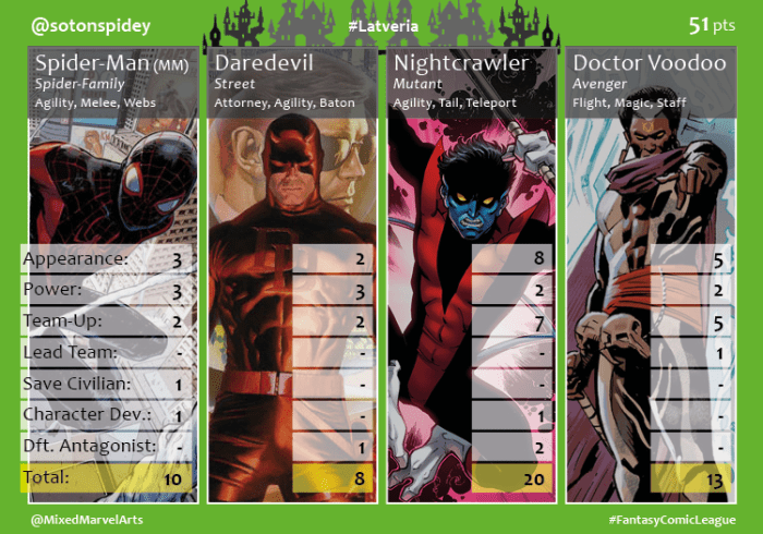In addition to bringing his varsity-level coaching to a new squad, King personally won the division with an impressive 111 points. His team featured January’s dynamic duo, Kitty Pryde and Rogue, who scored him a joint 71 points. Agent @adameastment left the Multiverse division and continued his streak of improved standings by securing second place. He drafted Logan, the hero of the month, and scored 89 points. Agent @SuperiorComic16 left the Wakanda division, but brought Black Panther with him to Latveria. Unfortunately, this was not T’Challa’s month. Superior scored 79 points thanks to the might of Storm, who scored 25 points for him and edged out both Peter Parker and Falcon’s 24 point performances. Human Torch heated up in January for new Fantasy Comic League Agent @JamesBSheppard. He starred in the Avengers “No Surrender” event and scored 26 of James’ 54 points. James also recruited Johnny’s fantastic teammate and costar of the new Marvel Two-in-One book, the Thing. Latveria stole another member of the Wakanda division, Agent @sotonspidey. He unfortunately suffered from sub par performances out of his M&M’s, Miles Morales and Matt Murdock. Nightcrawler scored 20 points for soton thanks to the weekly X-event, Phoenix Resurrection. Overall, soton’s last place performance netted him 51 points.
