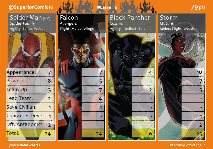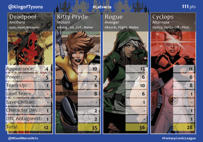 In an eventful month, which saw the League expand into three more jurisdictions for a total of seven battle sites, the agents of Latveria saved seven Latverians and prevented 13 antagonists from sowing further chaos. There were 14 character defining moments for the drafted heroes, while Peter Parker was the only character to hit for the Fantasy cycle. Kitty Pryde, Cyclops and Logan fell a category shy of achieving the feat as well. Fantasy Comic League veteran Agent @KingofTysons was transferred to Latveria to lead the new division and he recruited some of the top talent in Europe to help him. King paved the way for the Latveria crew becoming the top division in the league for the first month of 2018 with 384 points.