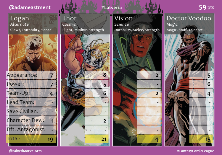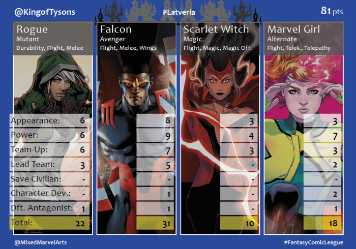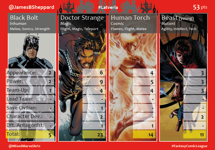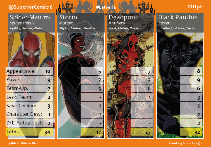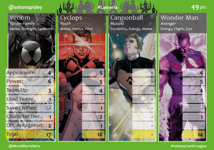 Agent @SuperiorComic16‘s team dominated the division on the backs of T’Challa and Peter Parker, the two highest scoring heroes from the month. Parker joined Panther in hitting for the Fantasy cycle. Superior scored 110 points, which would have been a new record if the high score had not been broken the previous month. Agent @KingofTysons possessed two of the Avengers leaders, Rogue and Falcon, and took a second place finish. Scarlet Witch was his weak link, only scoring 10 of his 81 points. Agent @adameastment followed in third place. Logan, his star hero, had a slow month by his standards. He scored 19 points, two less than Adam’s top hero Thor. He scored 59 total points. Agent @JamesBSheppard followed in a close fourth-place with 53 points. His Doctor Strange had a 23-point performance, but his Black Bolt had another underwhelming performance in the League when he only managed five points. Agent @sotonspidey struggled for the second month in a row. He could have avoided a last place finish if Cannonball made at least one appearance and contributed anything to his overall score of 49 points. The highlight of solon’s team came from the team-up between Venom and the X-Men Blue team. Young Cyclops and Eddie Brock scored him a joint 35 points.