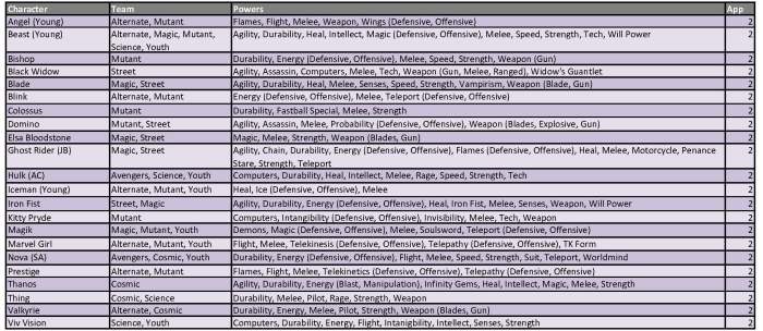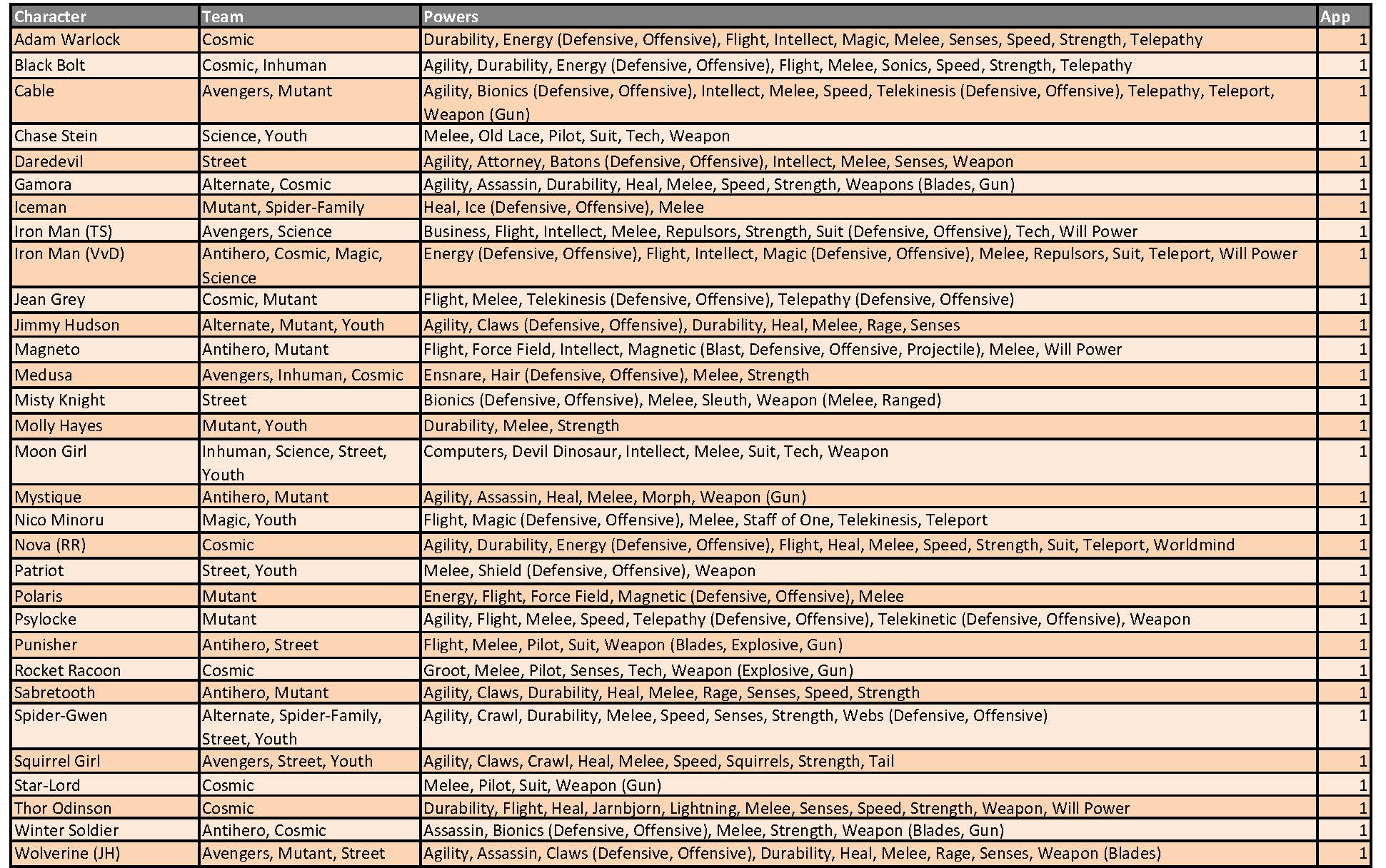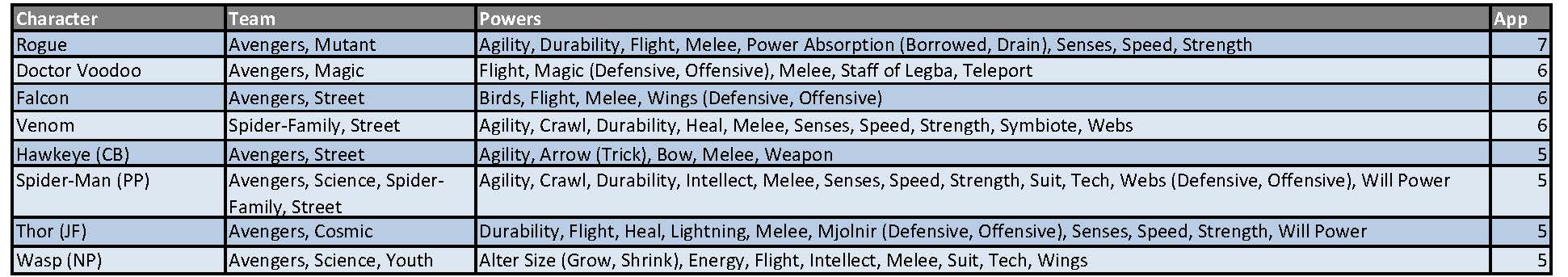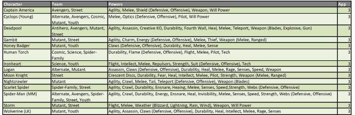 These appearance estimates, based on comic solicitations and cover artwork provided by the Marvel Database wiki, are meant as a guideline and not an indication of a specific draft order. Character names, team designations and power sets conform to the most current information provided by the Database. Power designations are simplified for easier classification and choice, providing the majority of the heroes with 9 to 11 eligible powers from which to choose. As a reminder, you may only have one hero per team designation on your roster and are allowed to select three powers from the heroes’ power set. Powers in (parenthesis) are a subset of the overall ability and can be selected as well as the generic use of that power. For example, Deadpool can be drafted as any of his four team classifications and can use Weapons, Blades and Guns as his three powers (Blades and Guns being a subset of the overall Weapons skill).